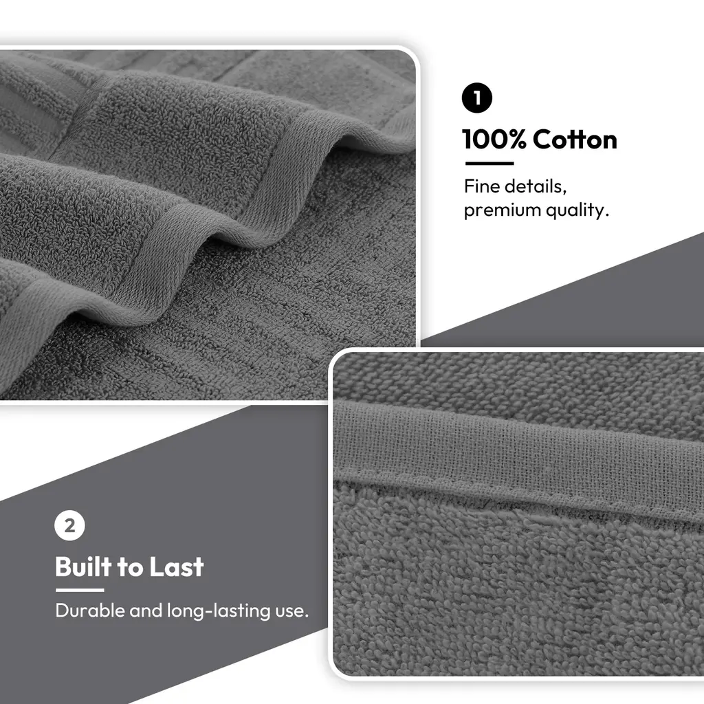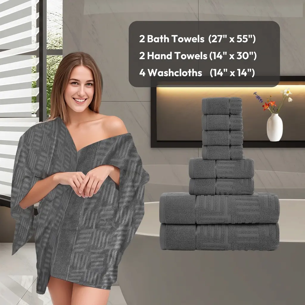 Material: 100% Cotton Package include: 2 bathroom towels (27 x 55 inches); 2 hand towels (14 x 30 inches); 4 washcloths (14 x 14 inches). Features: Hotel Collection - 8-Piece bathroom towel set contains 2 bathroom towels (27 x 55 inches), 2 hand towels (14 x 30 inches), and 4 washcloths (14 x 14 inches); Each towel is spun from 100% cotton - durable, quick-dry, and wonderfully absorbent. Elegant Jacquard Design - Featuring a sophisticated jacquard weave, JML 8-piece bath towel set boasts an intricate, timeless pattern that adds a touch of luxury and elegance to your bathroom decor. True Luxury and Super Soft Feel Every Time - The surface is smooth and not easy to shed, adding to our bath towel sets durability; Edges are reinforced with double needle embroidered stitching to prevent fraying from long-term use and laundering. Highly Absorbent, Fast Drying, No Lint - Our plush towels and washcloths sets, made from top-grade cotton, boast exceptional absorbency and quick-drying features, complemented by a lint-free experience. Easy Maintenance - These cotton towels for bathroom are hassle-free to maintain - simply machine wash them; They fluff up nicely and become even softer after the first wash, with minimal lint release that does not affect their aesthetics, functionality.