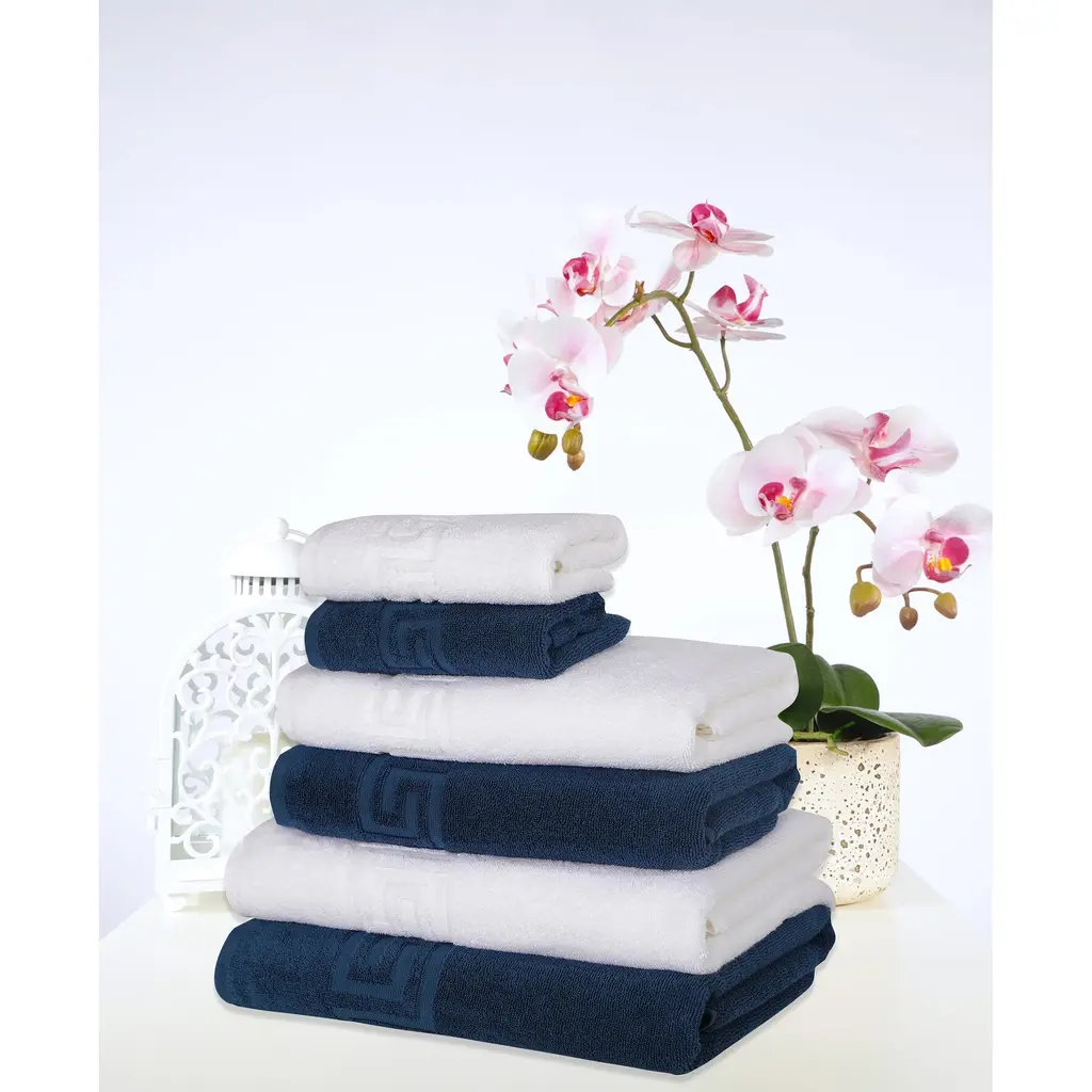 Milos Greek Key Design collection is made of finest quality 100% Turkish Cotton for supreme absorbency, durability and softness of touch. Greek Key Design is adding stylish touch to your bathroom. Milos Greek Key Towel collection is produced in state-of-the-art vertically integrated green Factory. Weight : 500 GSM, available in two sophisticated colors White and Navy.