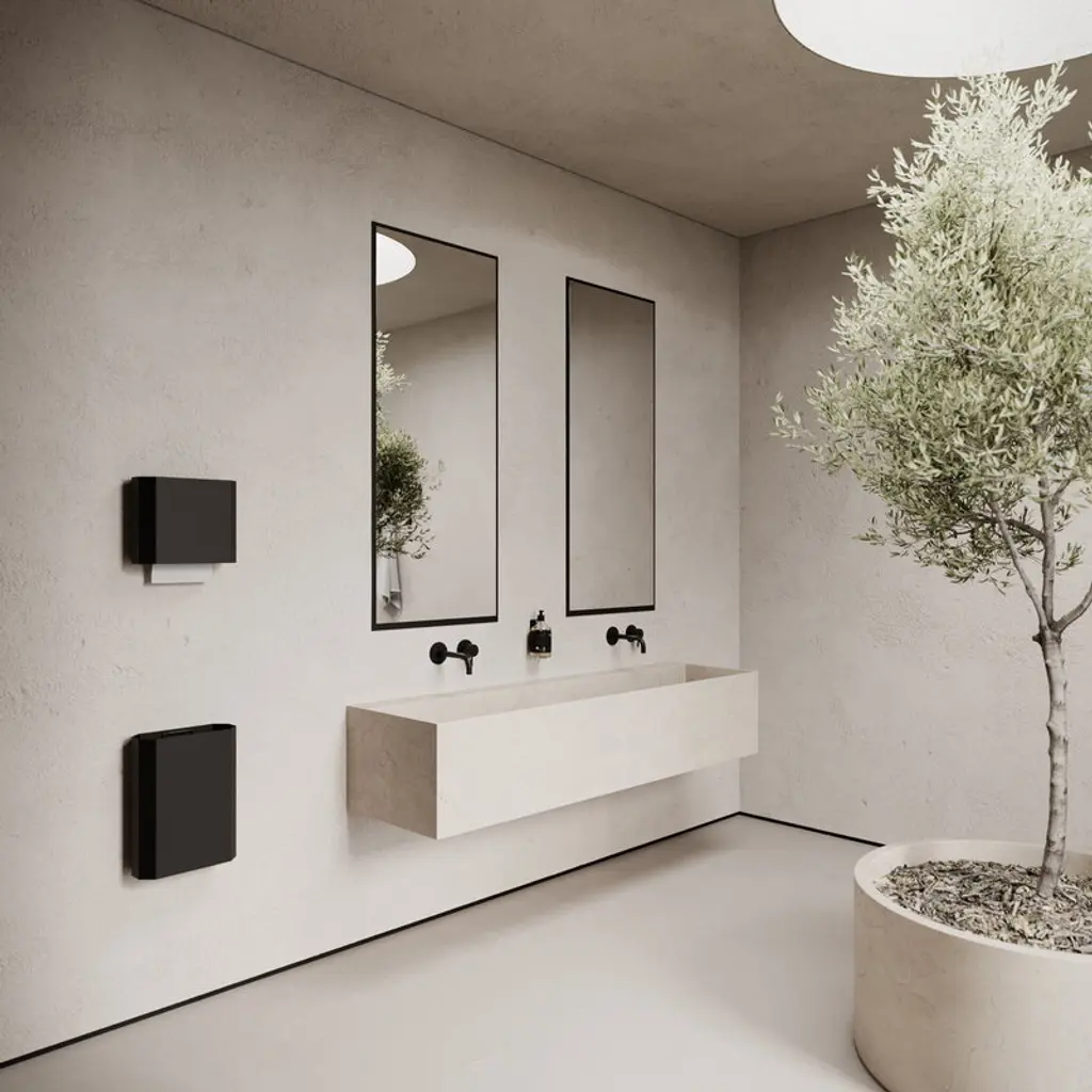 Nichba's paper dispenser is a minimalist and space-saving design, perfectly sized for standard hand towel sheets. This sleek, wall-mounted paper dispenser is crafted from powder-coated steel, making it both durable and easy to clean. Designed by Nichlas B. Andersen and made in Denmark, this compact hand towel holder is especially well-suited for smaller public spaces such as cafes, hotels and offices.