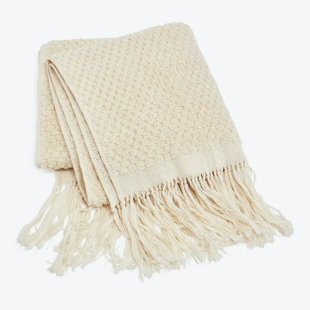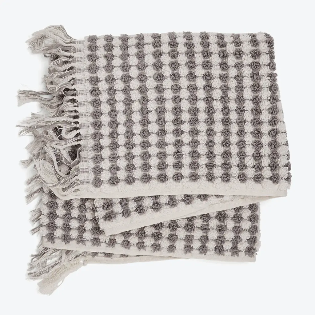 Woven from 100% organic cotton, these plush hand towels are designed for ultimate comfort. The striped pattern with a dotted effect is finished with long, soft tassels. The looped composition absorbs moisture quickly while retaining a palpable airiness. Named after Turkish baths, Hamam has been synonymous with bathing rituals and relaxation for centuries. Crafted by textile specialists in the same region that cultivated the art of steaming for spiritual cleansing, these all-natural, organic cotton linens are free from chemicals and are particularly absorbent. Miniscule spaces between fibers create a passageway for air, lending themselves to quick drying. Soft and plush, Hamam bath linens are as pure as the spirit that inspired them.