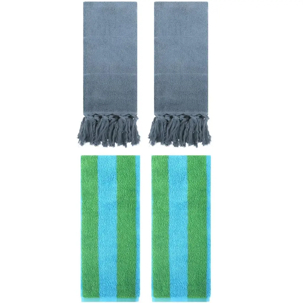 Regalwoven 4 Packs Striped And Solid Tassels Absorbent Soft Cotton Hand Towel For Bathroom Blue/green Blue