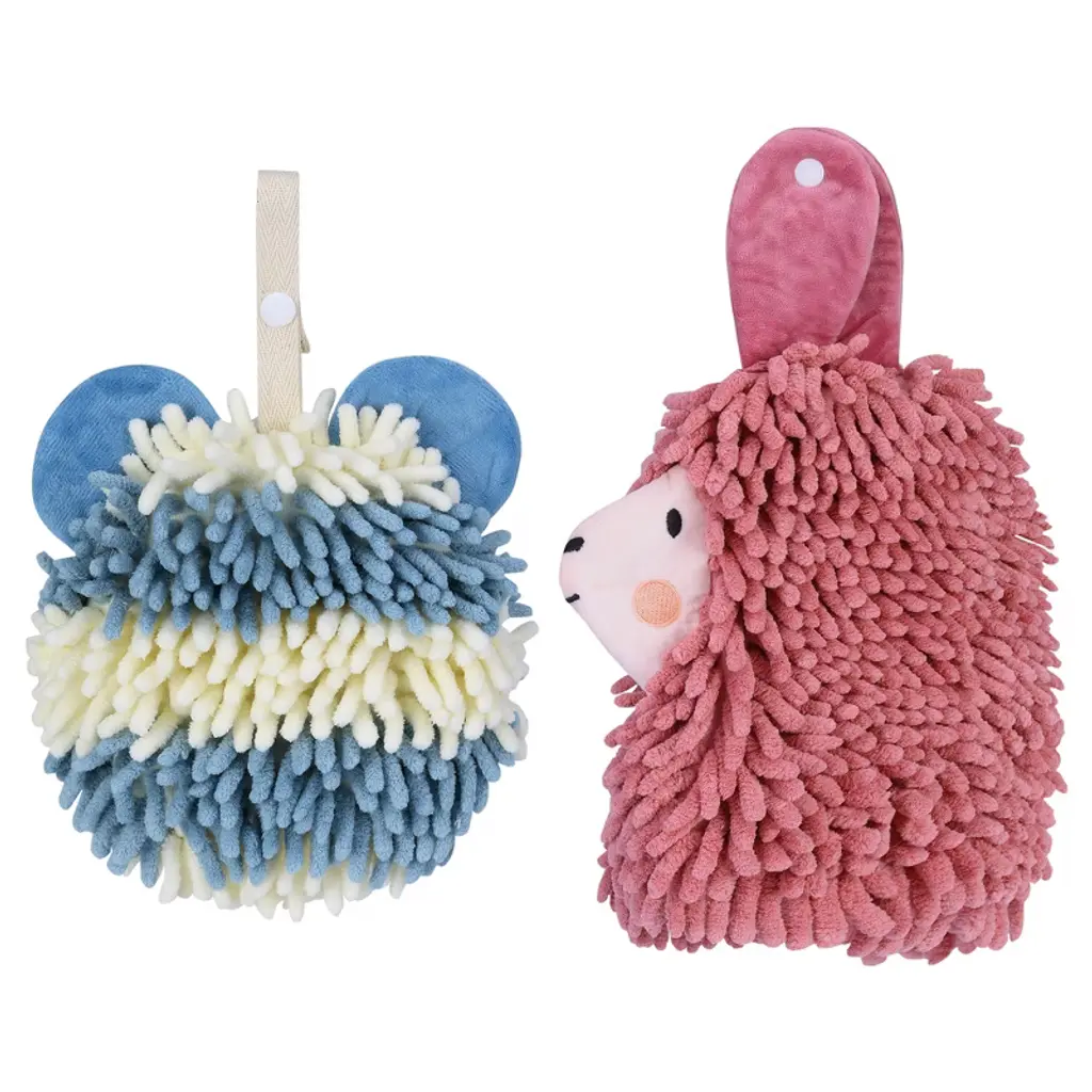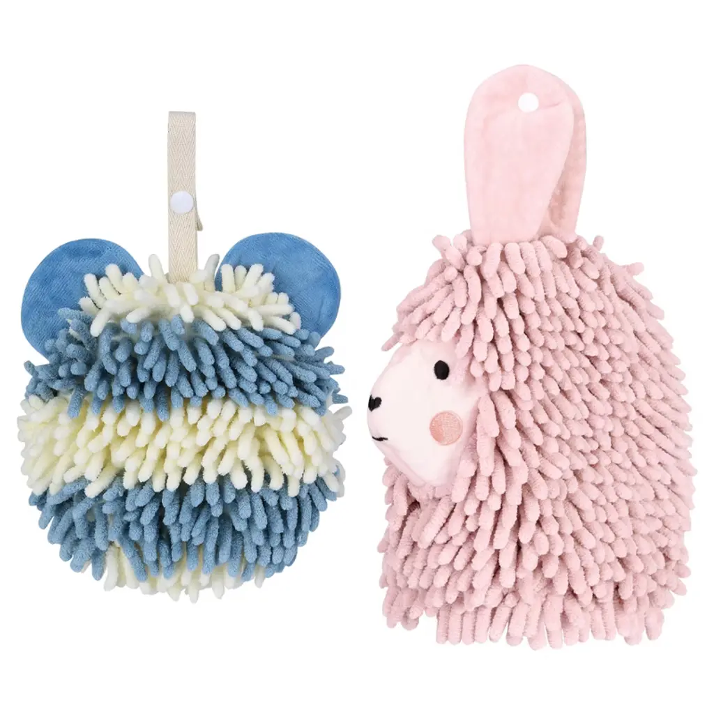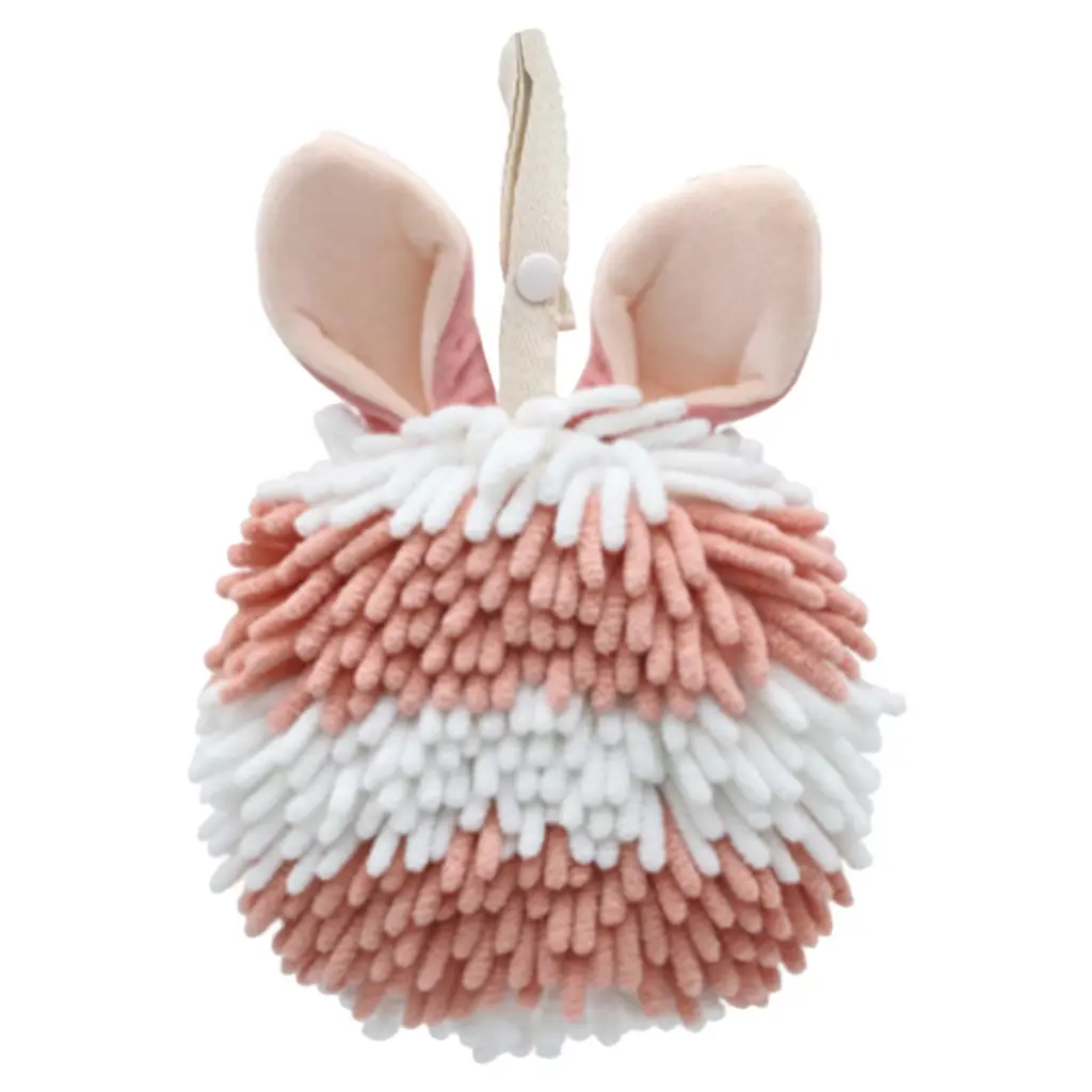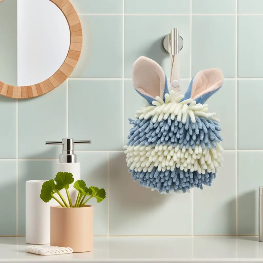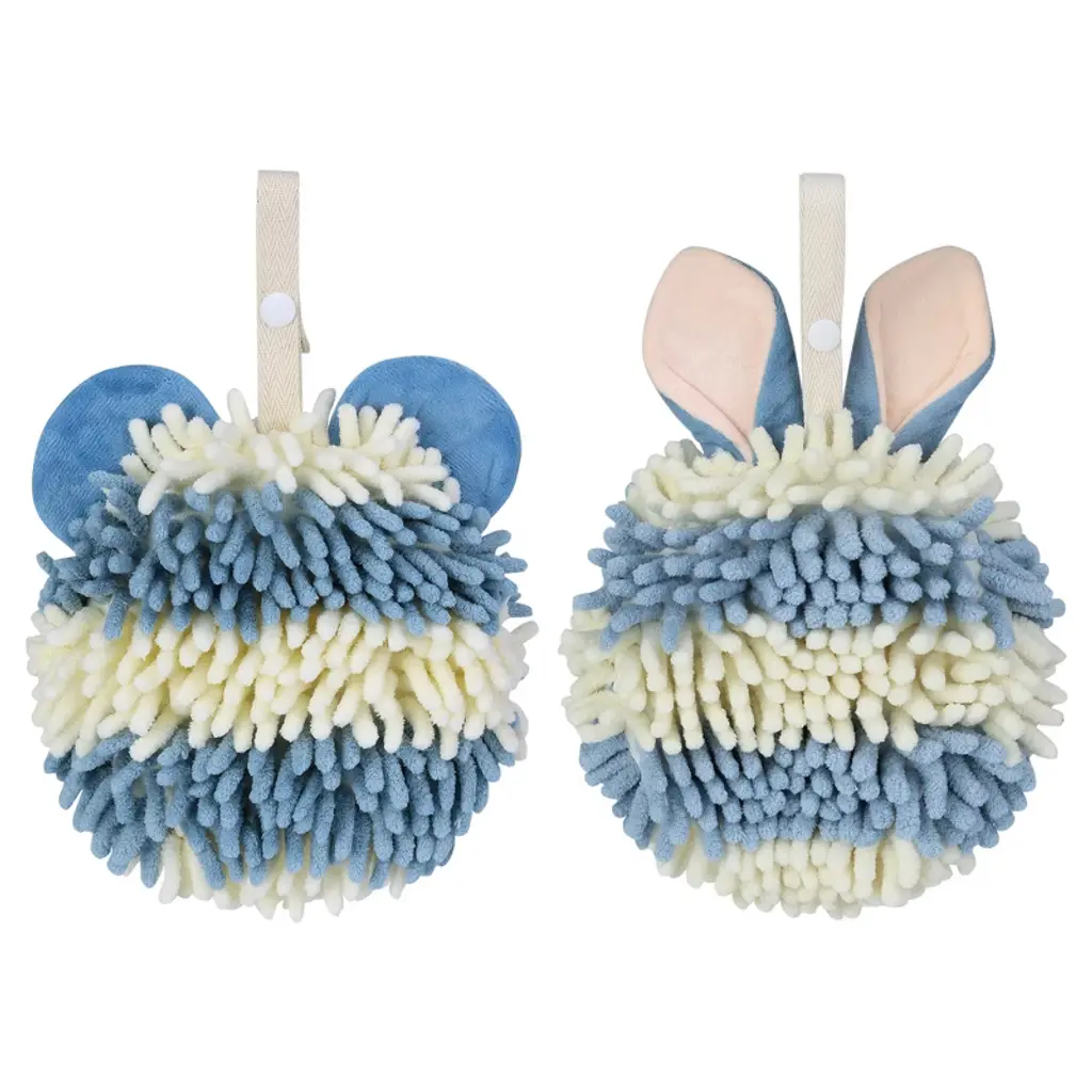 Regalwoven Chenille Fluffy Ball Rabbit Shape Soft Absorbent Quick Drying Hand Towel With Hanging Loop 7" X 7" 1 Pc Blue