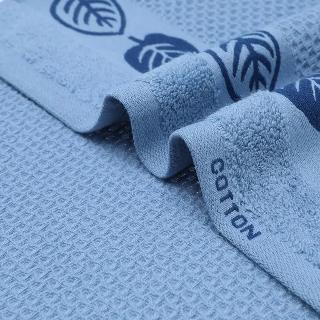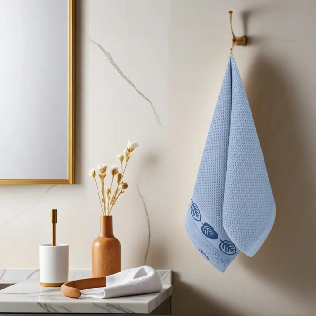 Regalwoven Cotton Soft Absorbent Waffle Design Leaves Pattern Decorative Hand Towel 13" X 29" 2 Pcs Blue