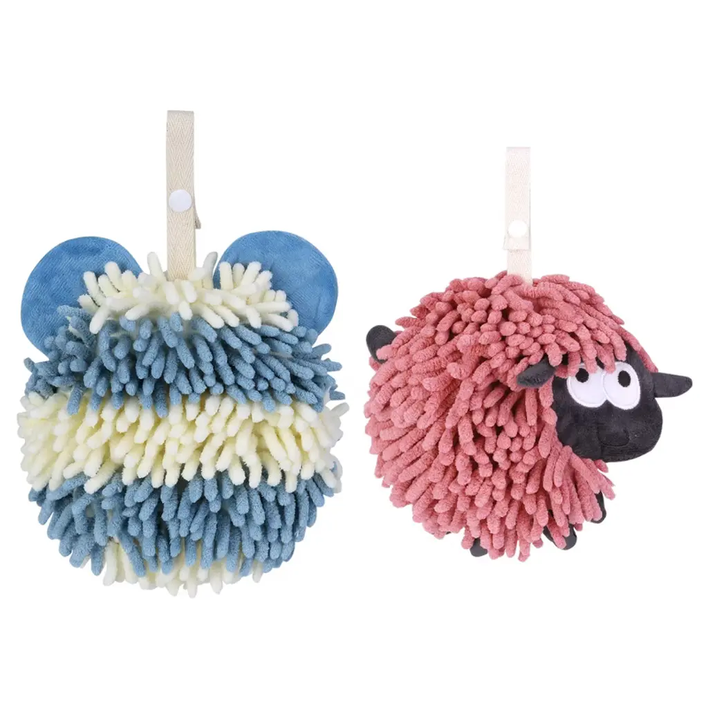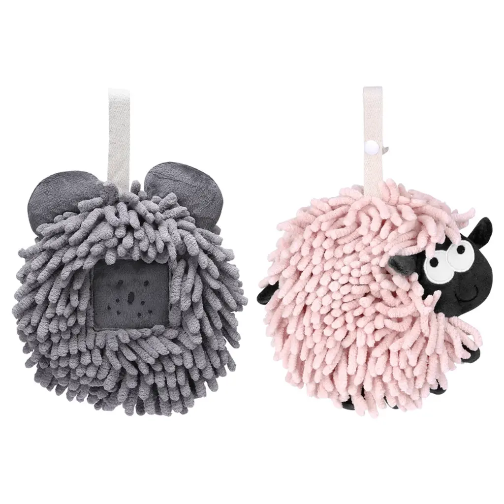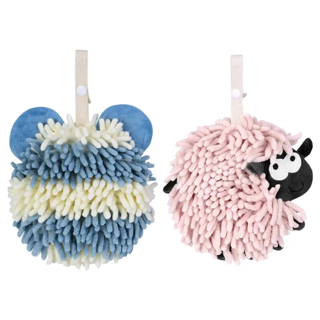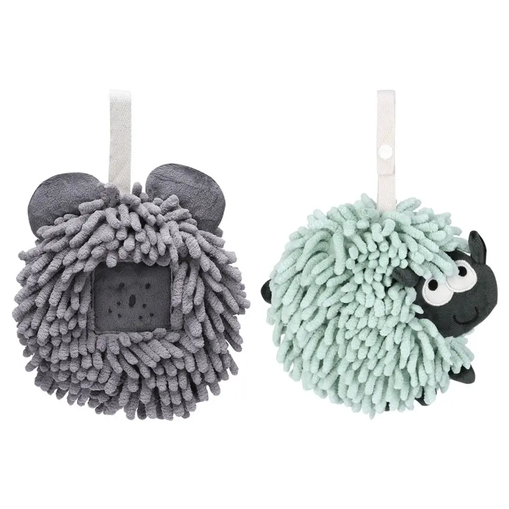 Regalwoven Cute Sheep Chenille Soft Absorbent Quick Drying Fuzzy Ball Hand Towel 9" X 13" 2 Pcs Blue/grey