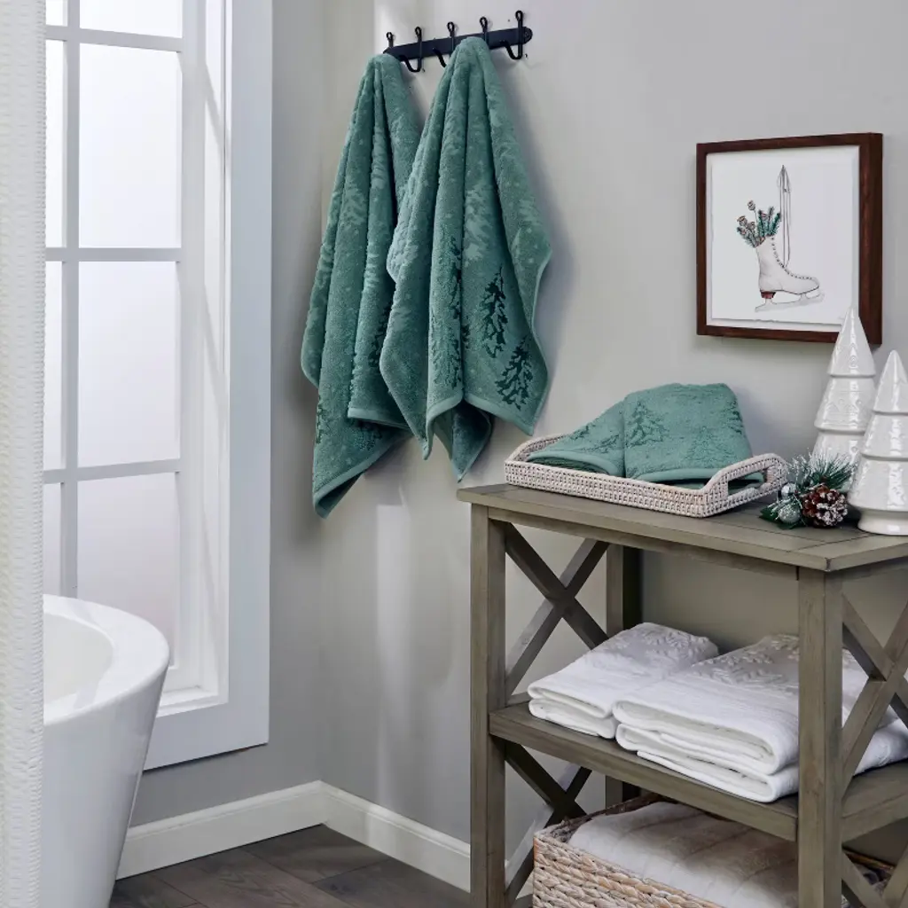 Spruce up your space with this plush bath towel. Made of soft terry jacquard, it features a tonal evergreen pattern with banded hem. Tonal threads with a sheen are woven into the tree inlays for an added touch of elegance. Great for use throughout the entire winter season. Coordinating hand towels sold separately. At SKL Home we bring personality, fun, and flair to your space with the best in home décor. We're a close-knit, small company full of big ideas in a wide variety of styles. From upbeat and modern, to classic and cozy, SKL Home has a look to complement any space. Combining 40+ years’ experience, global design inspiration, and the best fabrications, our employee-owned company continues to lead the way in home accessories.