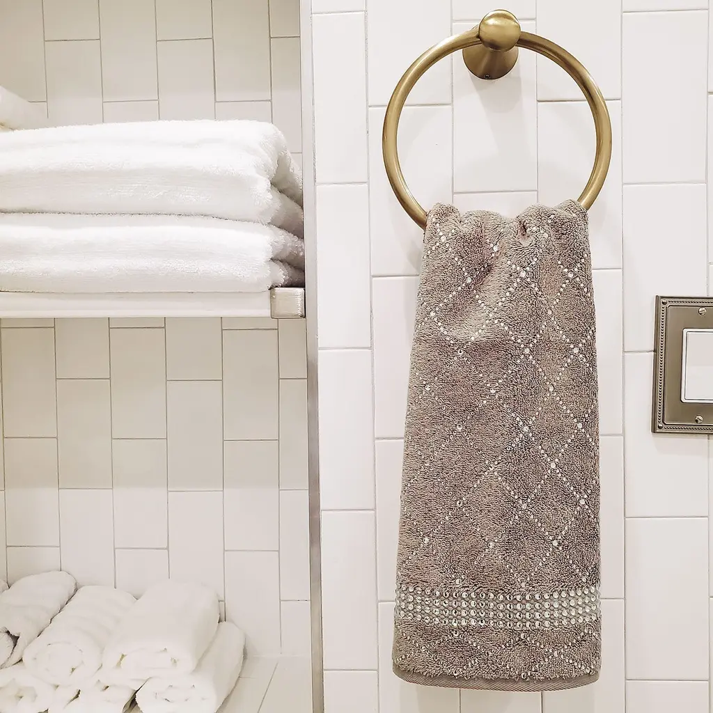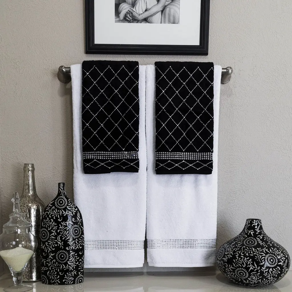 Elevate your bathroom decor with our Atlas Hand Towel, where glamour meets functionality. The intricate design, formed by sparkling rhinestones, adds a touch of luxury to your everyday routine.Made from 100% Turkish cotton terry, these towels go beyond being a glamorous bathroom accessory, they're designed to sparkle for a lifetime. Available in a range of colors, these hand towels feature a stunning X pattern made of genuine glass rhinestones for maximum shine.The Atlas Hand Towel measures 30" x 16", and is easy to keep clean. Just place it in a garment bag on a delicate cycle then lay out to dry.