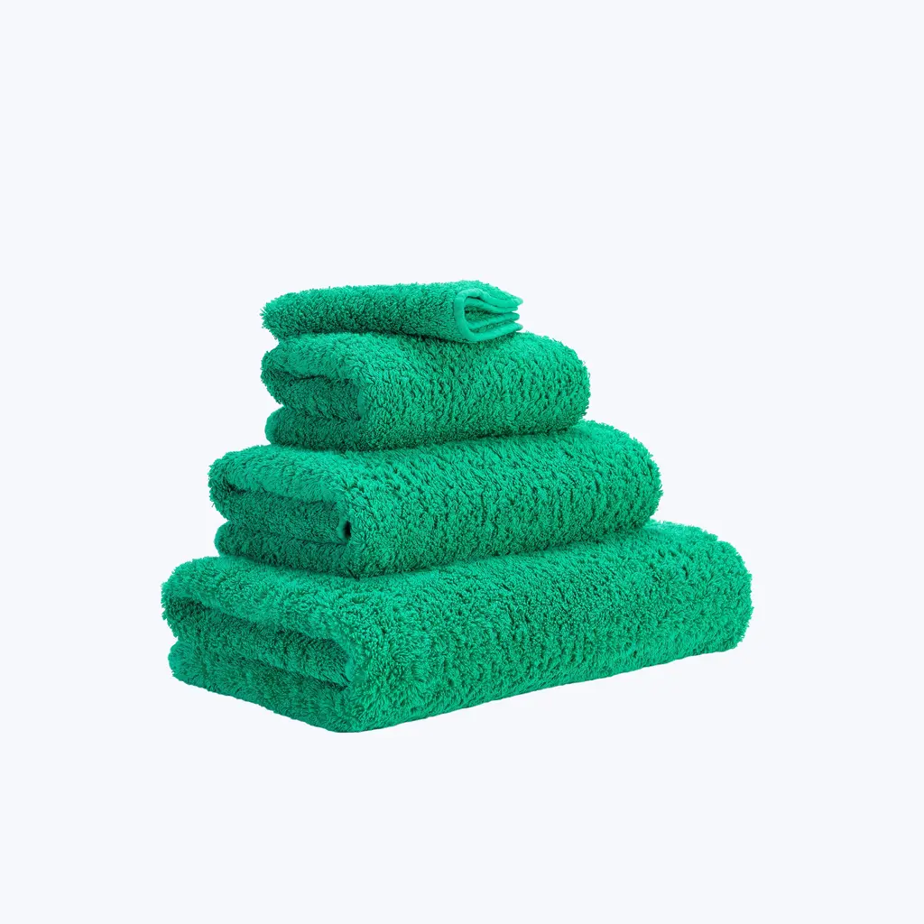 Super Pile Bath Towels are made from the finest 100% Giza Extra Long Staple Egyptian Cotton that's only grown in one small area of the Nile Delta. At 700 gsm, these bath towels are super absorbent, have a luxurious spa-like softness, and dry quicker courtesy of their longer loop with more surface area. The Super Pile Towel is finished with signature trim and rounded corners with discreet dyed labels to match this colorful emerald green towel. Elevate your bathing ritual to an art using Abyss and Habidecor. Made in northern Portugal for over 40 years, these high-quality luxury bath linens are made from the softest Egyptian cotton from Giza.
