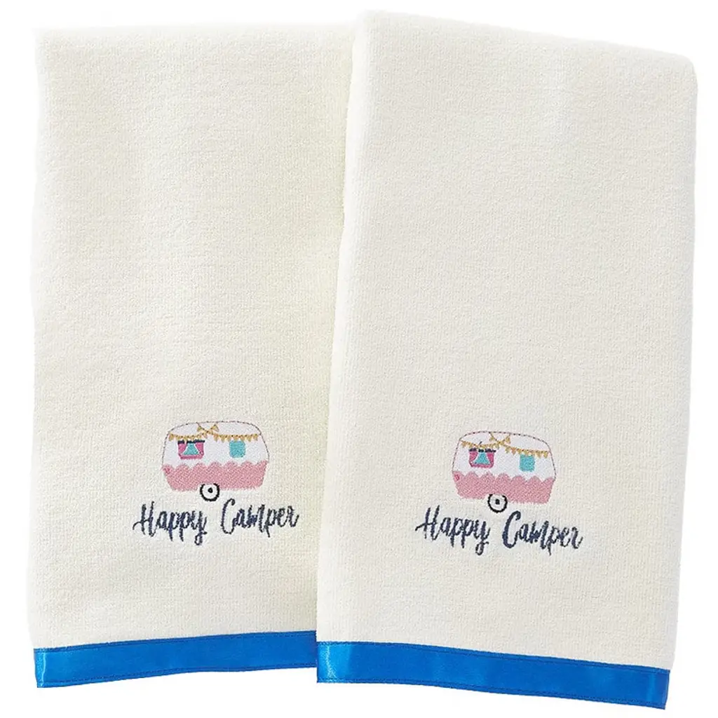 Glampers are glamorous campers, who bring along many of the comforts of home when they venture into the "wild." No roughing it for them! This 2-piece towel set is perfect for enhancing the bathroom décor in the home of a glamper, or even in their RV. Each hand towel is embroidered with an image of a pink camper and the saying "Happy Camper". These bathroom towels will add a decorative touch hanging on the towel bar or draped on the countertop. 15"W x 25"L, each. Polyester. Machine care.