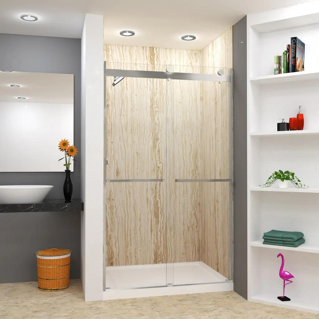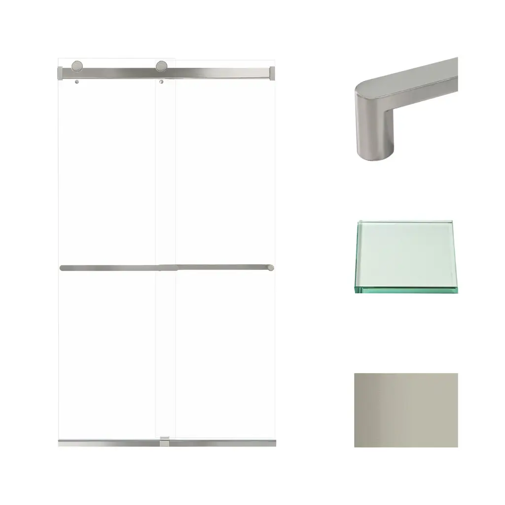 The Transolid Brianna Frameless Double Sliding Shower Door Collection offers an elegant, sophisticated look. It is available in several width and height combinations and features thick, premium 5/16 in. (8mm) clear tempered glass with professionally applied Nano clear glass coating, which provides superior dirt and water repellant and stain resistant benefits. The Brianna door provides up to 3/8 in. of out-of-plumb adjustability on each side to provide a watertight fit in your alcove. The Brianna door is available in several desirable hardware finish options to match your bathroom's interior design and layout perfectly. Built for an alcove (3-wall) shower enclosure, sliding glass shower doors can be opened from left or right with its full by-pass (both panels slide) design. 20 in. (500 mm from center to center) sliding shower door handles also function as towel bars, providing handy storage space for a folded bath towel or two hand towels. Multiple Transolid handle options are available, but this combination features the Sabrina handles. The Sabrina handles feature a unique, high-end design, adding a distinctive look to your Brianna shower door. These handles are substantial in weight and are every bit as functional as they are beautiful. Look for the matching grab bar to complete the look!Transolid BRP488008C-S Features: