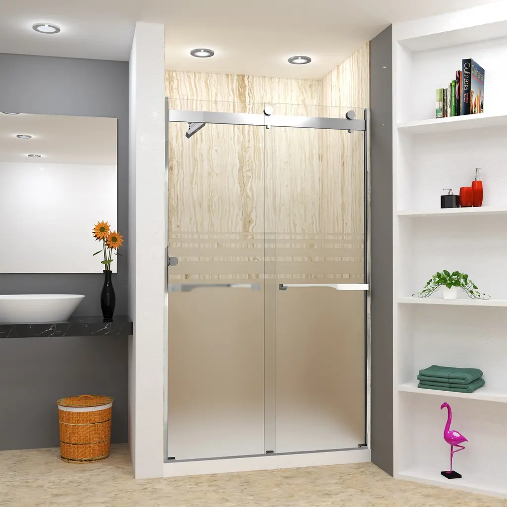 The Transolid Brianna Frameless Double Sliding Shower Door Collection offers an elegant, sophisticated look. It is available in several width and height combinations and features thick, premium 5/16 in. (8mm) frosted tempered glass with professionally applied Nano clear glass coating, which provides superior dirt and water repellant and stain resistant benefits. The Brianna door provides up to 3/8 in. of out-of-plumb adjustability on each side to provide a watertight fit in your alcove. The Brianna door is available in several desirable hardware finish options to match your bathroom's interior design and layout perfectly. Built for an alcove (3-wall) shower enclosure, sliding glass shower doors can be opened from left or right with its full by-pass (both panels slide) design. 20 in. (500 mm from center to center) sliding shower door handles also function as towel bars, providing handy storage space for a folded bath towel or two hand towels. Multiple Transolid handle options are available, but this combination features the Justin handles. The Justin handles feature a unique, high-end design, adding a distinctive look to your Brianna shower door. These handles are substantial in weight and are every bit as functional as they are beautiful. Look for the matching grab bar to complete the look!Transolid BRP488008F-J Features: