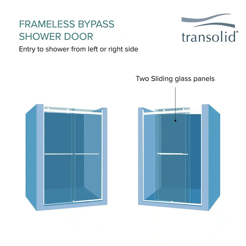 The Transolid Brianna Frameless Double Sliding Shower Door Collection offers an elegant, sophisticated look. It is available in several width and height combinations and features thick, premium 5/16 in. (8mm) frosted tempered glass with professionally applied Nano clear glass coating, which provides superior dirt and water repellant and stain resistant benefits. The Brianna door provides up to 3/8 in. of out-of-plumb adjustability on each side to provide a watertight fit in your alcove. The Brianna door is available in several desirable hardware finish options to match your bathroom's interior design and layout perfectly. Built for an alcove (3-wall) shower enclosure, sliding glass shower doors can be opened from left or right with its full by-pass (both panels slide) design. 20 in. (500 mm from center to center) sliding shower door handles also function as towel bars, providing handy storage space for a folded bath towel or two hand towels. Multiple Transolid handle options are available, but this combination features the Sabrina handles. The Sabrina handles feature a unique, high-end design, adding a distinctive look to your Brianna shower door. These handles are substantial in weight and are every bit as functional as they are beautiful. Look for the matching grab bar to complete the look!Transolid BRP488008F-S Features: