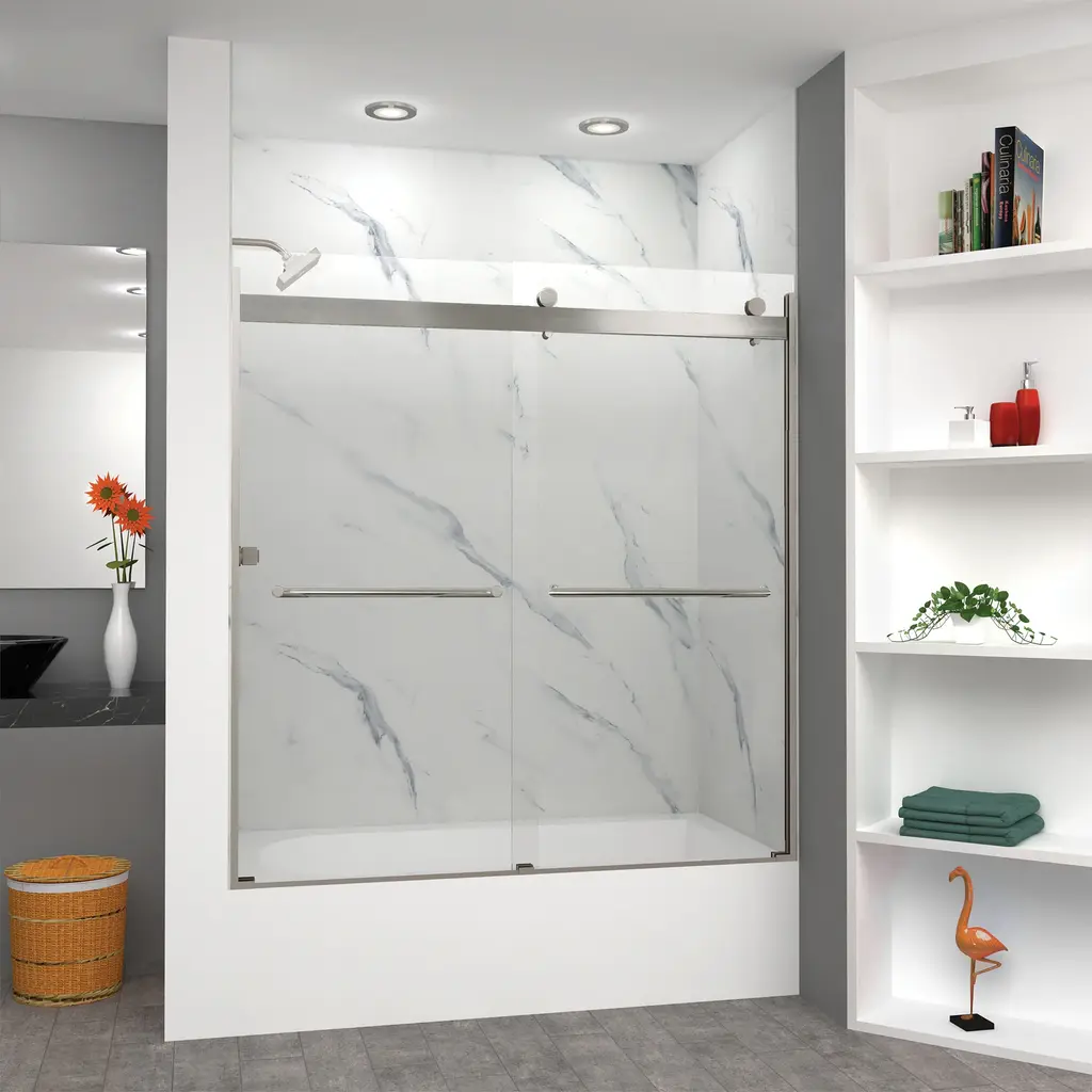 The Transolid Brianna Frameless Double Sliding Shower Door Collection offers an elegant, sophisticated look. It is available in several width and height combinations and features thick, premium 5/16 in. (8mm) clear tempered glass with professionally applied Nano clear glass coating, which provides superior dirt and water repellant and stain resistant benefits. The Brianna door provides up to 3/8 in. of out-of-plumb adjustability on each side to provide a watertight fit in your alcove. The Brianna door is available in several desirable hardware finish options to match your bathroom's interior design and layout perfectly. Built for an alcove (3-wall) shower enclosure, sliding glass shower doors can be opened from left or right with its full by-pass (both panels slide) design. 20 in. (500 mm from center to center) sliding shower door handles also function as towel bars, providing handy storage space for a folded bath towel or two hand towels. Multiple Transolid handle options are available, but this combination features the Turin handles. The Turin handles feature a unique, high-end design, adding a distinctive look to your Brianna shower door. These handles are substantial in weight and are every bit as functional as they are beautiful. Look for the matching grab bar to complete the look!Transolid BRP606208C-T Features: