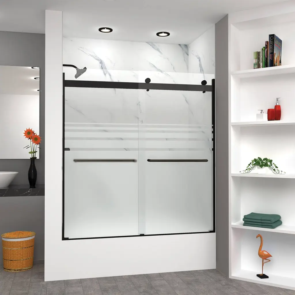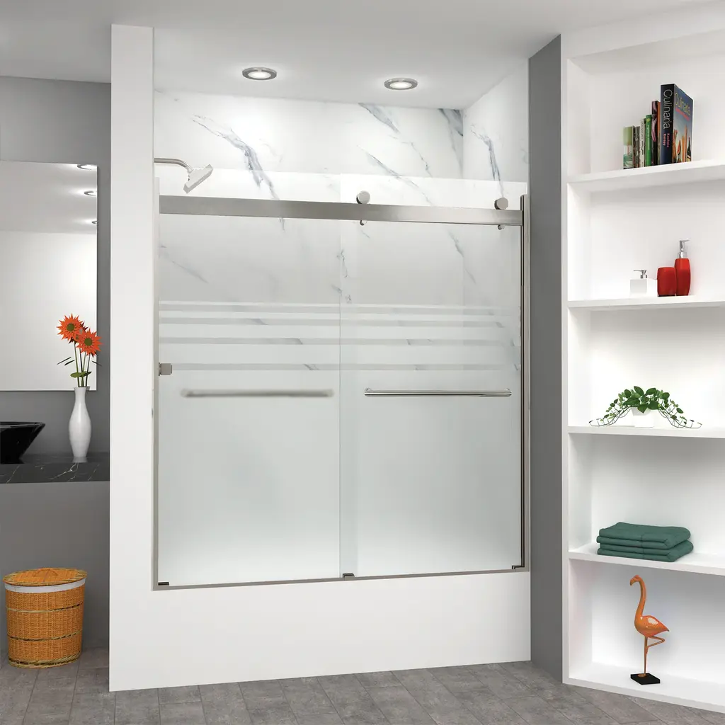 The Transolid Brianna Frameless Double Sliding Shower Door Collection offers an elegant, sophisticated look. It is available in several width and height combinations and features thick, premium 5/16 in. (8mm) frosted tempered glass with professionally applied Nano clear glass coating, which provides superior dirt and water repellant and stain resistant benefits. The Brianna door provides up to 3/8 in. of out-of-plumb adjustability on each side to provide a watertight fit in your alcove. The Brianna door is available in several desirable hardware finish options to match your bathroom's interior design and layout perfectly. Built for an alcove (3-wall) shower enclosure, sliding glass shower doors can be opened from left or right with its full by-pass (both panels slide) design. 20 in. (500 mm from center to center) sliding shower door handles also function as towel bars, providing handy storage space for a folded bath towel or two hand towels. Multiple Transolid handle options are available, but this combination features the Turin handles. The Turin handles feature a unique, high-end design, adding a distinctive look to your Brianna shower door. These handles are substantial in weight and are every bit as functional as they are beautiful. Look for the matching grab bar to complete the look!Transolid BRP606208F-T Features: