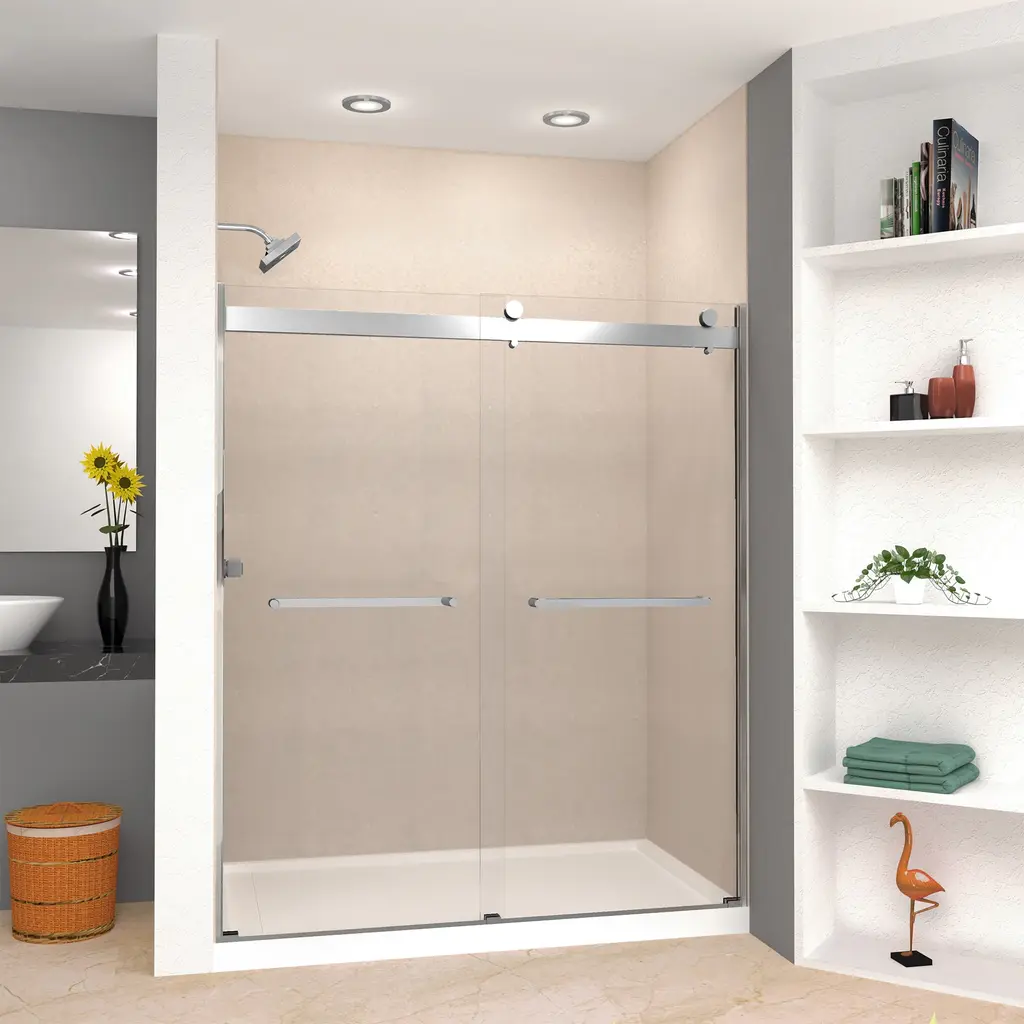 The Transolid Brianna Frameless Double Sliding Shower Door Collection offers an elegant, sophisticated look. It is available in several width and height combinations and features thick, premium 5/16 in. (8mm) clear tempered glass with professionally applied Nano clear glass coating, which provides superior dirt and water repellant and stain resistant benefits. The Brianna door provides up to 3/8 in. of out-of-plumb adjustability on each side to provide a watertight fit in your alcove. The Brianna door is available in several desirable hardware finish options to match your bathroom's interior design and layout perfectly. Built for an alcove (3-wall) shower enclosure, sliding glass shower doors can be opened from left or right with its full by-pass (both panels slide) design. 20 in. (500 mm from center to center) sliding shower door handles also function as towel bars, providing handy storage space for a folded bath towel or two hand towels. Multiple Transolid handle options are available, but this combination features the Riley handles. The Riley handles feature a unique, high-end design, adding a distinctive look to your Brianna shower door. These handles are substantial in weight and are every bit as functional as they are beautiful. Look for the matching grab bar to complete the look!Transolid BRP607008C-R Features: