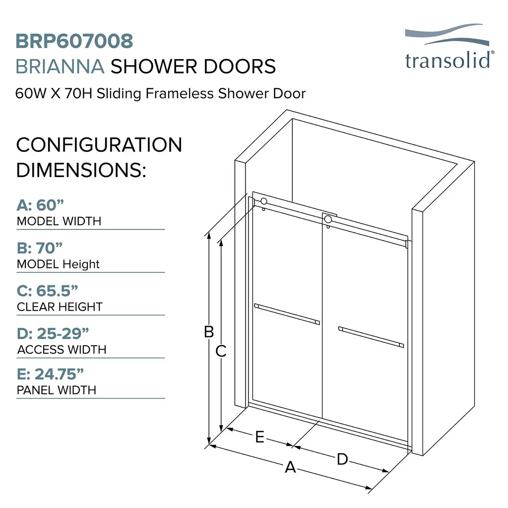 The Transolid Brianna Frameless Double Sliding Shower Door Collection offers an elegant, sophisticated look. It is available in several width and height combinations and features thick, premium 5/16 in. (8mm) frosted tempered glass with professionally applied Nano clear glass coating, which provides superior dirt and water repellant and stain resistant benefits. The Brianna door provides up to 3/8 in. of out-of-plumb adjustability on each side to provide a watertight fit in your alcove. The Brianna door is available in several desirable hardware finish options to match your bathroom's interior design and layout perfectly. Built for an alcove (3-wall) shower enclosure, sliding glass shower doors can be opened from left or right with its full by-pass (both panels slide) design. 20 in. (500 mm from center to center) sliding shower door handles also function as towel bars, providing handy storage space for a folded bath towel or two hand towels. Multiple Transolid handle options are available, but this combination features the Justin. The Justin handles feature a unique, high-end design, adding a distinctive look to your Brianna shower door. These handles are substantial in weight and are every bit as functional as they are beautiful. Look for the matching grab bar to complete the look!Transolid BRP607008F-J Features:
