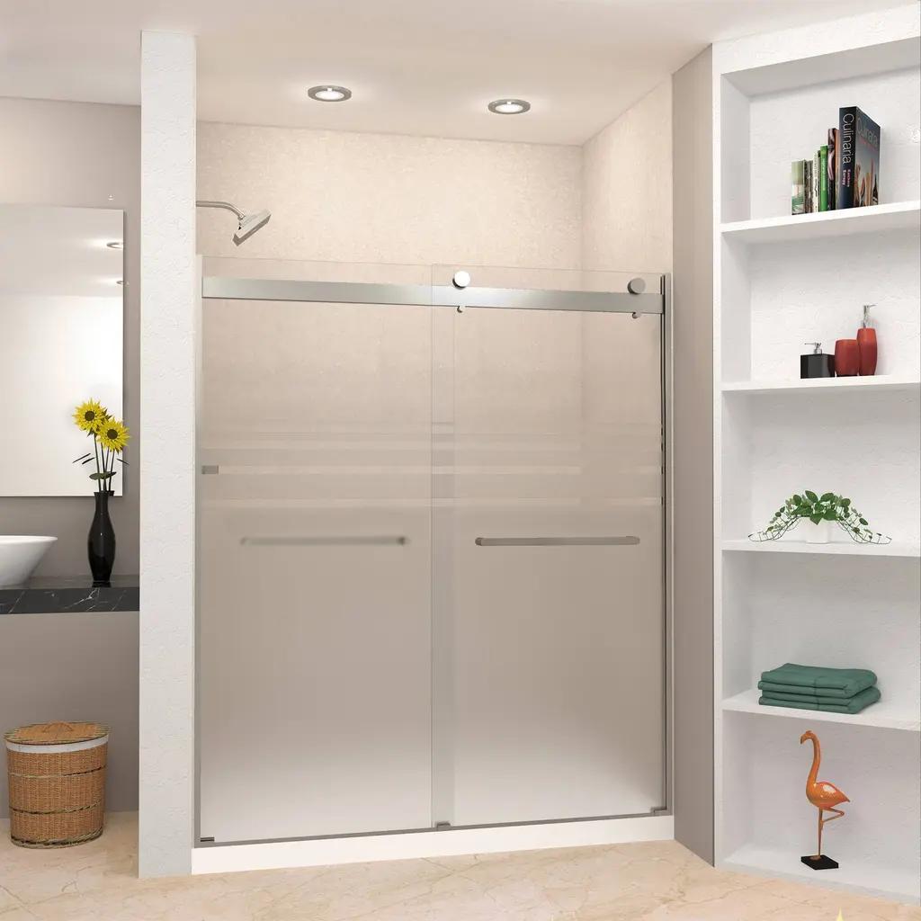 The Transolid Brianna Frameless Double Sliding Shower Door Collection offers an elegant, sophisticated look. It is available in several width and height combinations and features thick, premium 5/16 in. (8mm) frosted tempered glass with professionally applied Nano clear glass coating, which provides superior dirt and water repellant and stain resistant benefits. The Brianna door provides up to 3/8 in. of out-of-plumb adjustability on each side to provide a watertight fit in your alcove. The Brianna door is available in several desirable hardware finish options to match your bathroom's interior design and layout perfectly. Built for an alcove (3-wall) shower enclosure, sliding glass shower doors can be opened from left or right with its full by-pass (both panels slide) design. 20 in. (500 mm from center to center) sliding shower door handles also function as towel bars, providing handy storage space for a folded bath towel or two hand towels. Multiple Transolid handle options are available, but this combination features the Riley. The Riley handles feature a unique, high-end design, adding a distinctive look to your Brianna shower door. These handles are substantial in weight and are every bit as functional as they are beautiful. Look for the matching grab bar to complete the look!Transolid BRP607008F-R Features: