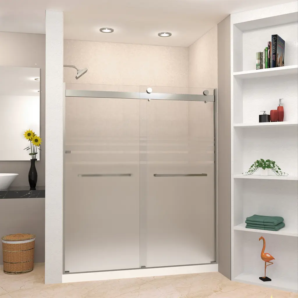 The Transolid Brianna Frameless Double Sliding Shower Door Collection offers an elegant, sophisticated look. It is available in several width and height combinations and features thick, premium 5/16 in. (8mm) frosted tempered glass with professionally applied Nano clear glass coating, which provides superior dirt and water repellant and stain resistant benefits. The Brianna door provides up to 3/8 in. of out-of-plumb adjustability on each side to provide a watertight fit in your alcove. The Brianna door is available in several desirable hardware finish options to match your bathroom's interior design and layout perfectly. Built for an alcove (3-wall) shower enclosure, sliding glass shower doors can be opened from left or right with its full by-pass (both panels slide) design. 20 in. (500 mm from center to center) sliding shower door handles also function as towel bars, providing handy storage space for a folded bath towel or two hand towels. Multiple Transolid handle options are available, but this combination features the Sabrina handles. The Sabrina handles feature a unique, high-end design, adding a distinctive look to your Brianna shower door. These handles are substantial in weight and are every bit as functional as they are beautiful. Look for the matching grab bar to complete the look!Transolid BRP607008F-S Features: