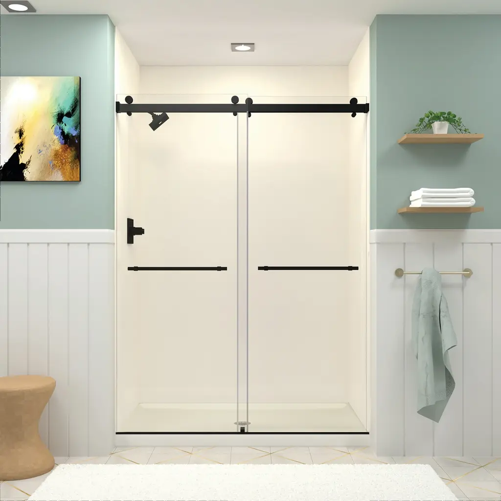 The Transolid Brooklyn frameless double sliding shower door collection offers an elegant, sophisticated look. It is available in 60 in. W x 80 in. H and features thick, premium 3/8 in. (10mm) clear tempered glass with professionally applied Nano clear glass coating, which provides superior dirt and water repellant and stain resistant benefits. The Brooklyn door provides up to 3/8 in. of out-of-plumb adjustability on each side to provide a watertight fit in your alcove. The Brooklyn door is available in several desirable hardware finish options to match your bathroom's interior design and layout perfectly. Built for an alcove (3-wall) shower enclosure, sliding glass shower doors can be opened from left or right with its full by-pass (both panels slide) design. 20 in. (500 mm from center to center) sliding shower door handles also function as towel bars, providing handy storage space for a folded bath towel or two hand towels. Multiple Transolid handle options are available, but this combination features the Barrington Knurled handles. The Barrington Knurled handles feature a unique, high-end design, adding a distinctive look to your Brooklyn shower door. These handles are substantial in weight and are every bit as functional as they are beautiful. Look for the matching grab bar to complete the look!Transolid BYPT608010C-BK Features: