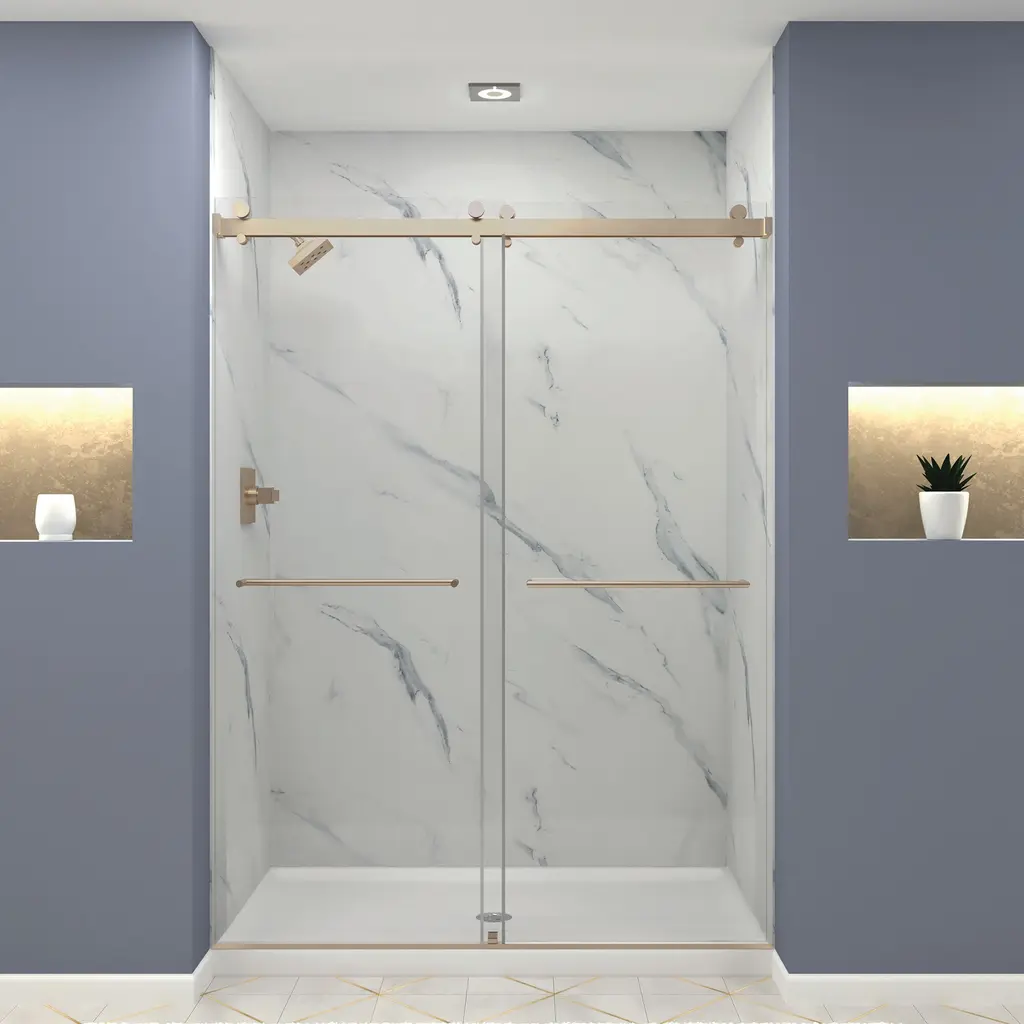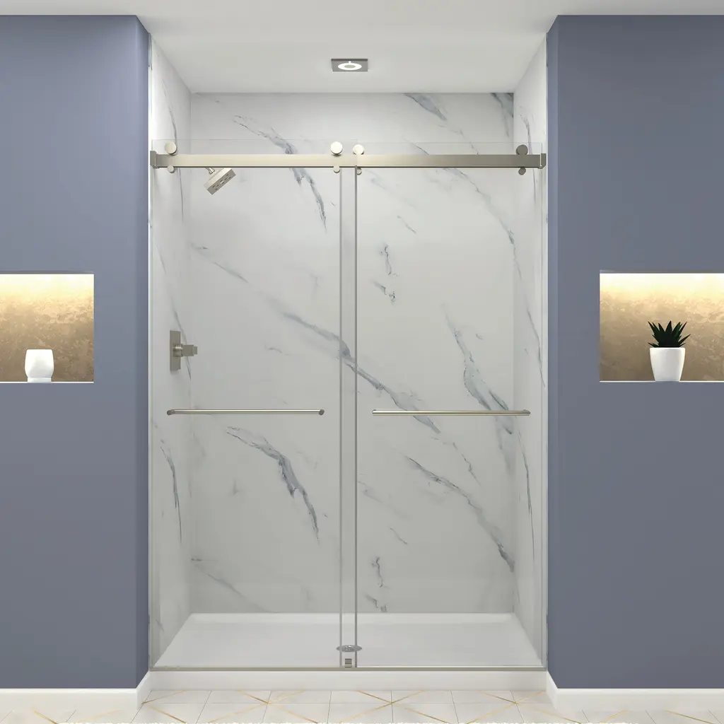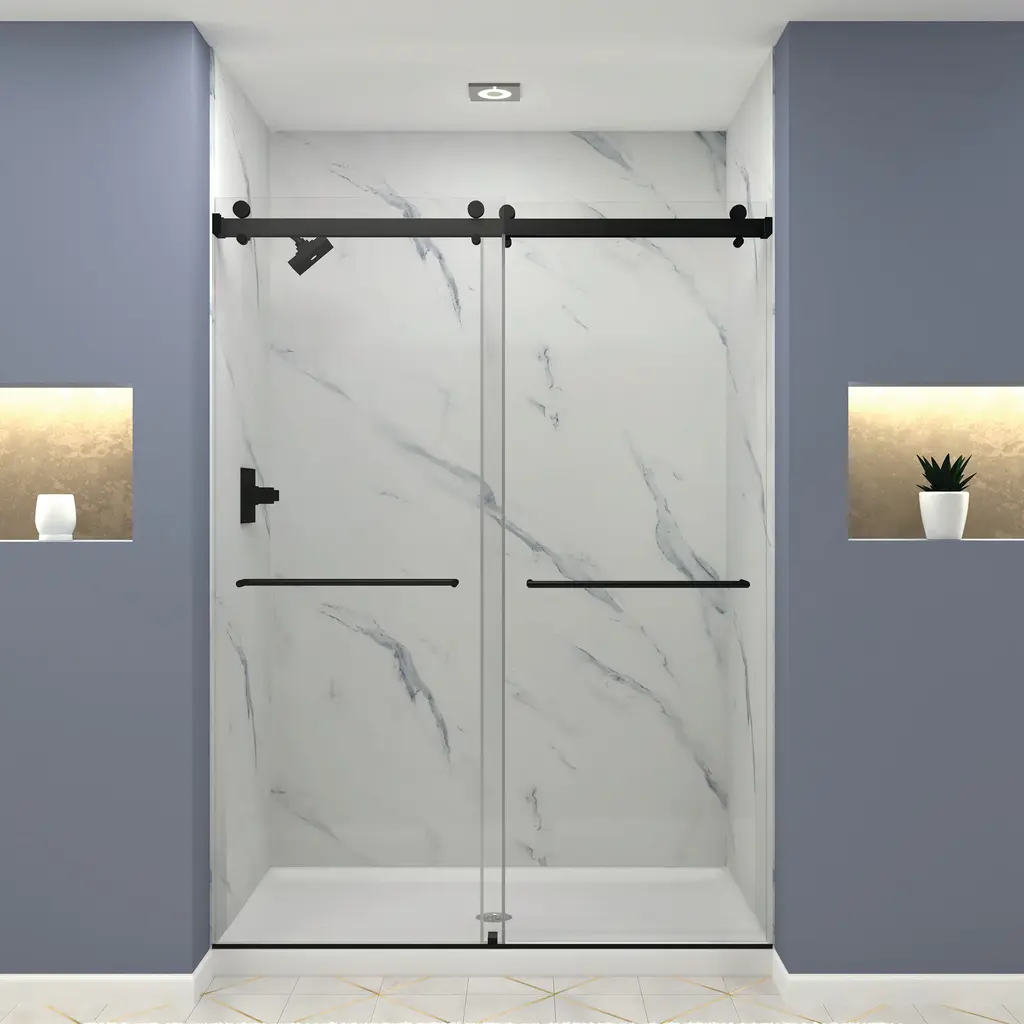 The Transolid Brooklyn frameless double sliding shower door collection offers an elegant, sophisticated look. It is available in 60 in. W x 80 in. H and features thick, premium 3/8 in. (10mm) clear tempered glass with professionally applied Nano clear glass coating, which provides superior dirt and water repellant and stain resistant benefits. The Brooklyn door provides up to 3/8 in. of out-of-plumb adjustability on each side to provide a watertight fit in your alcove. The Brooklyn door is available in several desirable hardware finish options to match your bathroom's interior design and layout perfectly. Built for an alcove (3-wall) shower enclosure, sliding glass shower doors can be opened from left or right with its full by-pass (both panels slide) design. 20 in. (500 mm from center to center) sliding shower door handles also function as towel bars, providing handy storage space for a folded bath towel or two hand towels. Multiple Transolid handle options are available, but this combination features the Turin handles. The Turin handles feature a unique, high-end design, adding a distinctive look to your Brooklyn shower door. These handles are substantial in weight and are every bit as functional as they are beautiful. Look for the matching grab bar to complete the look!Transolid BYPT608010C-T Features: