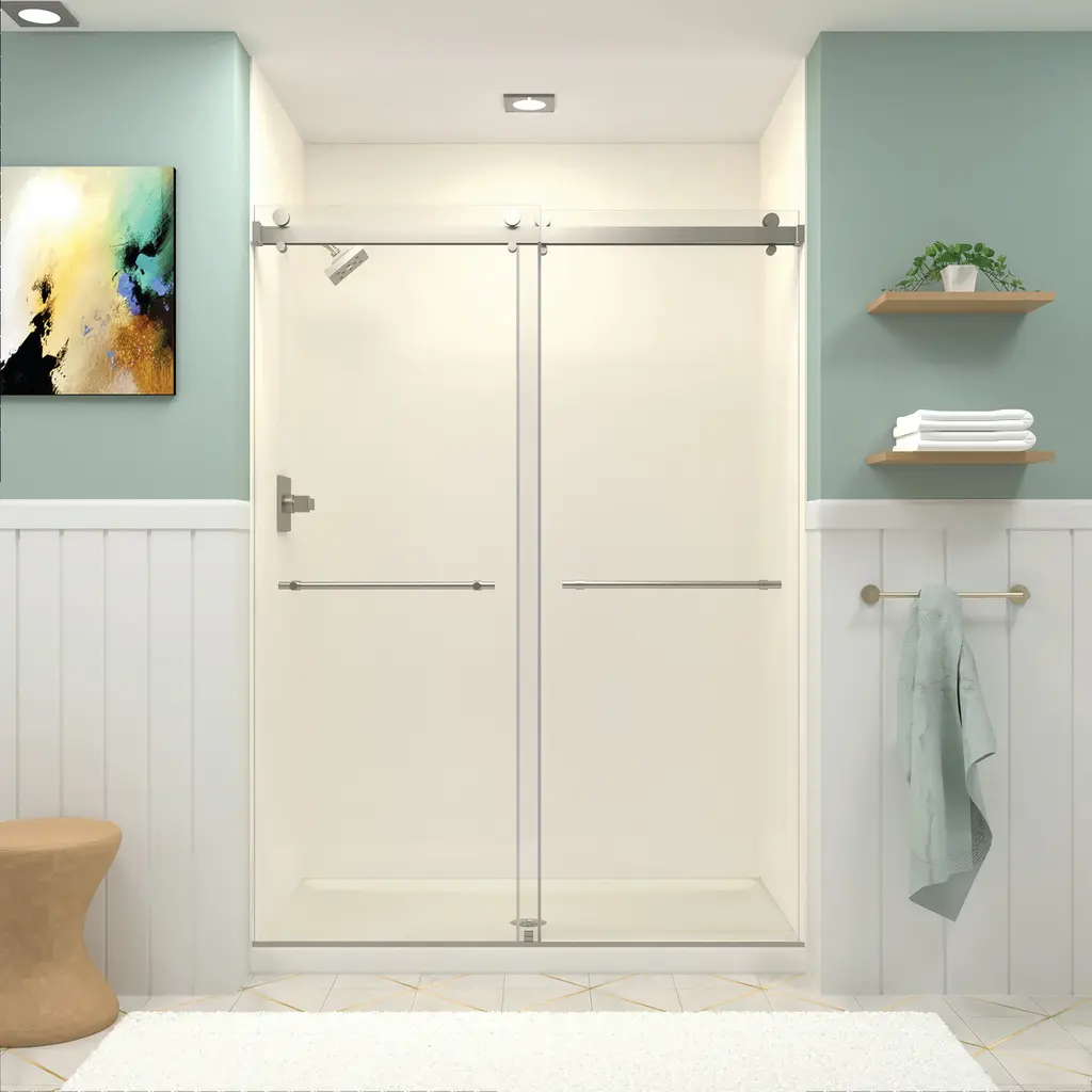 The Transolid Brooklyn frameless double sliding shower door collection offers an elegant, sophisticated look. It is available in 60 in. W x 80 in. H and features thick, premium 3/8 in. (10mm) clear tempered glass with professionally applied Nano clear glass coating, which provides superior dirt and water repellant and stain resistant benefits. The Brooklyn door provides up to 3/8 in. of out-of-plumb adjustability on each side to provide a watertight fit in your alcove. The Brooklyn door is available in several desirable hardware finish options to match your bathroom's interior design and layout perfectly. Built for an alcove (3-wall) shower enclosure, sliding glass shower doors can be opened from left or right with its full by-pass (both panels slide) design. 20 in. (500 mm from center to center) sliding shower door handles also function as towel bars, providing handy storage space for a folded bath towel or two hand towels. Multiple Transolid handle options are available, but this combination features the Barrington Knurled handles. The Barrington Knurled handles feature a unique, high-end design, adding a distinctive look to your Brooklyn shower door. These handles are substantial in weight and are every bit as functional as they are beautiful. Look for the matching grab bar to complete the look!Transolid BYPT608010L-BK Features: