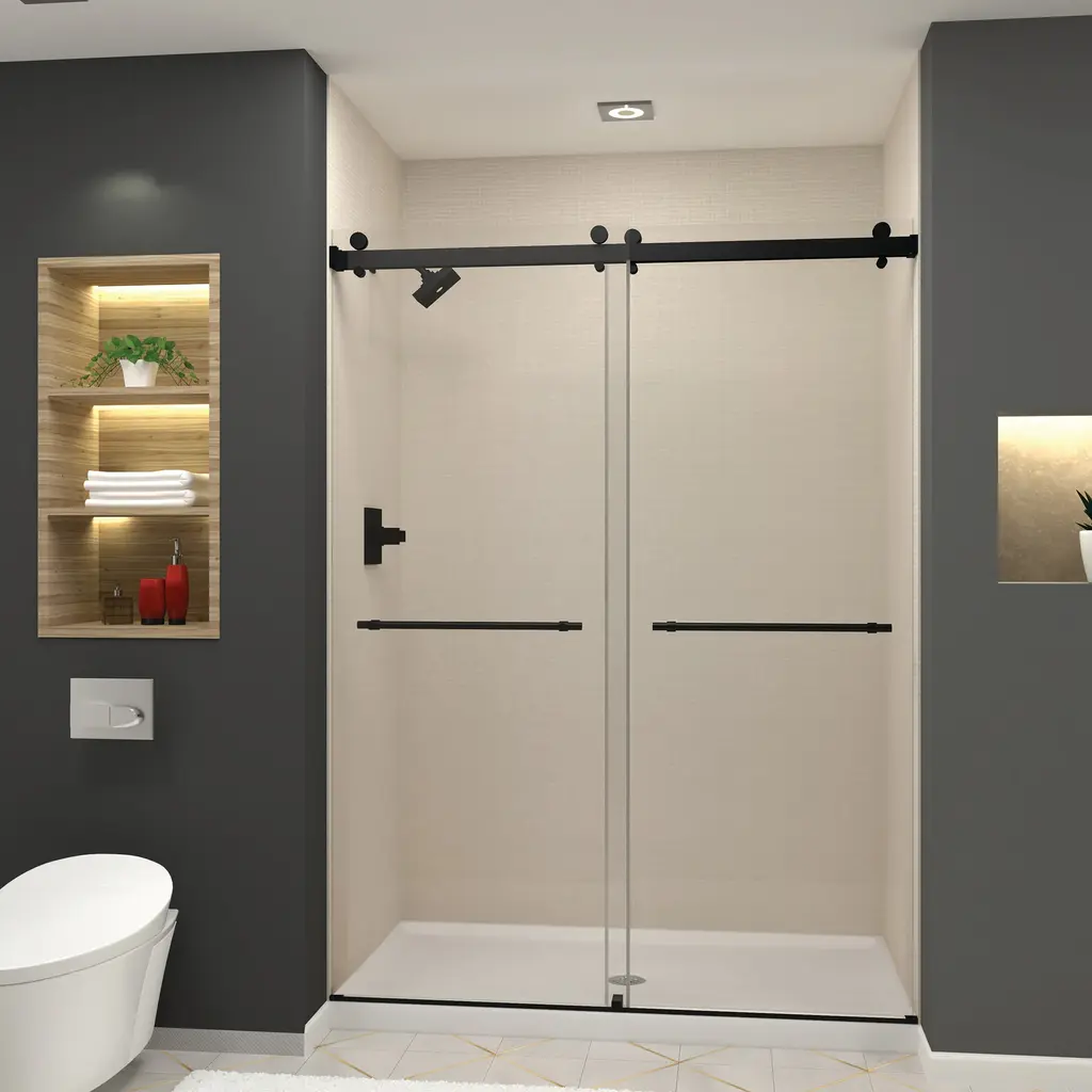 The Transolid Brooklyn Frameless Double Sliding Shower Door Collection offers an elegant, sophisticated look. It is available in 60 in. W x 80 in. H and features thick, premium 3/8 in. (10mm) clear tempered glass with professionally applied Nano clear glass coating, which provides superior dirt and water repellant and stain resistant benefits. The Brooklyn door provides up to 3/8 in. of out-of-plumb adjustability on each side to provide a watertight fit in your alcove. The Brooklyn Door is available in several desirable hardware finish options to match your bathroom's interior design and layout perfectly. Built for an alcove (3-wall) shower enclosure, sliding glass shower doors can be opened from left or right with its full by-pass (both panels slide) design. 20 in. (500 mm from center to center) sliding shower door handles also function as towel bars, providing handy storage space for a folded bath towel or two hand towels. Multiple Transolid handle options are available, but this combination features the Barrington Plain handles. The Barrington Plain handles feature a unique, high-end design, adding a distinctive look to your Brooklyn shower door. These handles are substantial in weight and are every bit as functional as they are beautiful. Look for the matching grab bar to complete the look!Transolid BYPT608010L-BP Features: