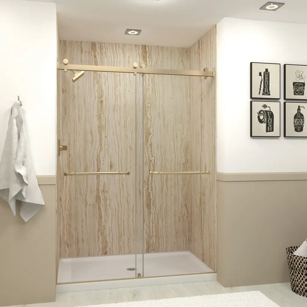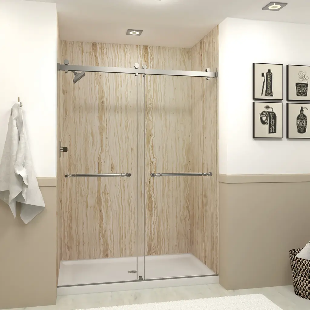 The Transolid Brooklyn Frameless Double Sliding Shower Door Collection offers an elegant, sophisticated look. It is available in 60 in. W x 80 in. H and features thick, premium 3/8 in. (10mm) clear tempered glass with professionally applied Nano clear glass coating, which provides superior dirt and water repellant and stain resistant benefits. The Brooklyn door provides up to 3/8 in. of out-of-plumb adjustability on each side to provide a watertight fit in your alcove. The Brooklyn Door is available in several desirable hardware finish options to match your bathroom's interior design and layout perfectly. Built for an alcove (3-wall) shower enclosure, sliding glass shower doors can be opened from left or right with its full by-pass (both panels slide) design. 20 in. (500 mm from center to center) sliding shower door handles also function as towel bars, providing handy storage space for a folded bath towel or two hand towels. Multiple Transolid handle options are available, but this combination features the Niles handles. The Niles handles feature a unique, high-end design, adding a distinctive look to your Brooklyn shower door. These handles are substantial in weight and are every bit as functional as they are beautiful. Look for the matching grab bar to complete the look!Transolid BYPT608010L-N Features:
