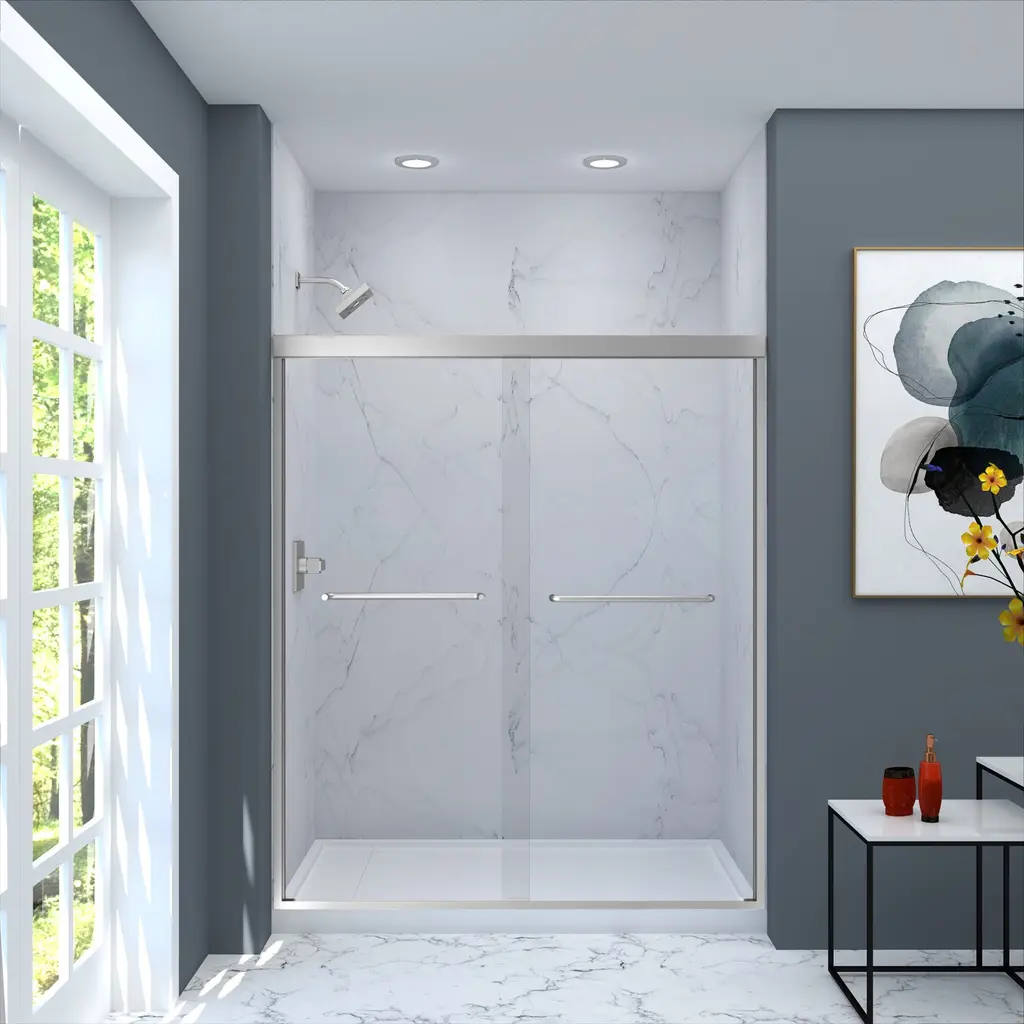 The Transolid Cara Slim By-Pass Shower Door Collection combines the practicality of a space saving design with custom quality craftsmanship. The collection features 1/4 in. (6mm) clear tempered glass and the Cara door provides up to 2/5 in. of out-of-plumb adjustability on each side to provide a watertight fit in your alcove. The Cara Door is available in several different height options with three desirable hardware finish options to match your bathroom's interior design and layout perfectly. Built for an alcove (3-wall) shower enclosure, sliding glass shower doors can be opened from left or right with its full by-pass (both panels slide) design. 20 in. (500 mm from center to center) contoured sliding shower door handles also function as towel bars, providing handy storage space for a folded bath towel or two hand towels.Transolid CBP607006C Features: