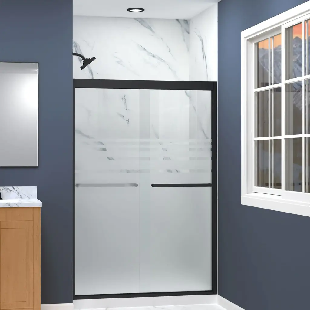 The Transolid Frederick Semi-Frameless By-Pass Shower Door Collection combines the practicality of a space saving design with custom quality craftsmanship. The collection features thick, premium 5/16 in. (8mm) frosted tempered glass with professionally applied Nano Frosted glass coating, which provides superior dirt and water repellant and stain resistant benefits. TruMotion® technology makes our shower doors close softly and effortlessly no matter how hard you slam them or how heavy they are and the Frederick door provides up to 2/5 in. of out-of-plumb adjustability on each side to provide a watertight fit in your alcove. The Frederick Door is available in a wide array of width and height options with several desirable hardware finish options to match your bathroom's interior design and layout perfectly. Built for an alcove (3-wall) shower enclosure, sliding glass shower doors can be opened from left or right with its full by-pass (both panels slide) design. 20 in. (500 mm from center to center) sliding shower door handles also function as towel bars, providing handy storage space for a folded bath towel or two hand towels. Multiple Transolid handle options are available, but this combination features the contemporary Riley handles. The Riley handles are part of the Meridian series and feature a unique, high-end design, adding a distinctive look to your Frederick shower door. These handles are substantial in weight and are every bit as functional as they are beautiful. Look for the matching grab bar to complete the look!Transolid FBPT487008F-R Features:Overall Height: 70" (bottom to top of door fixture)