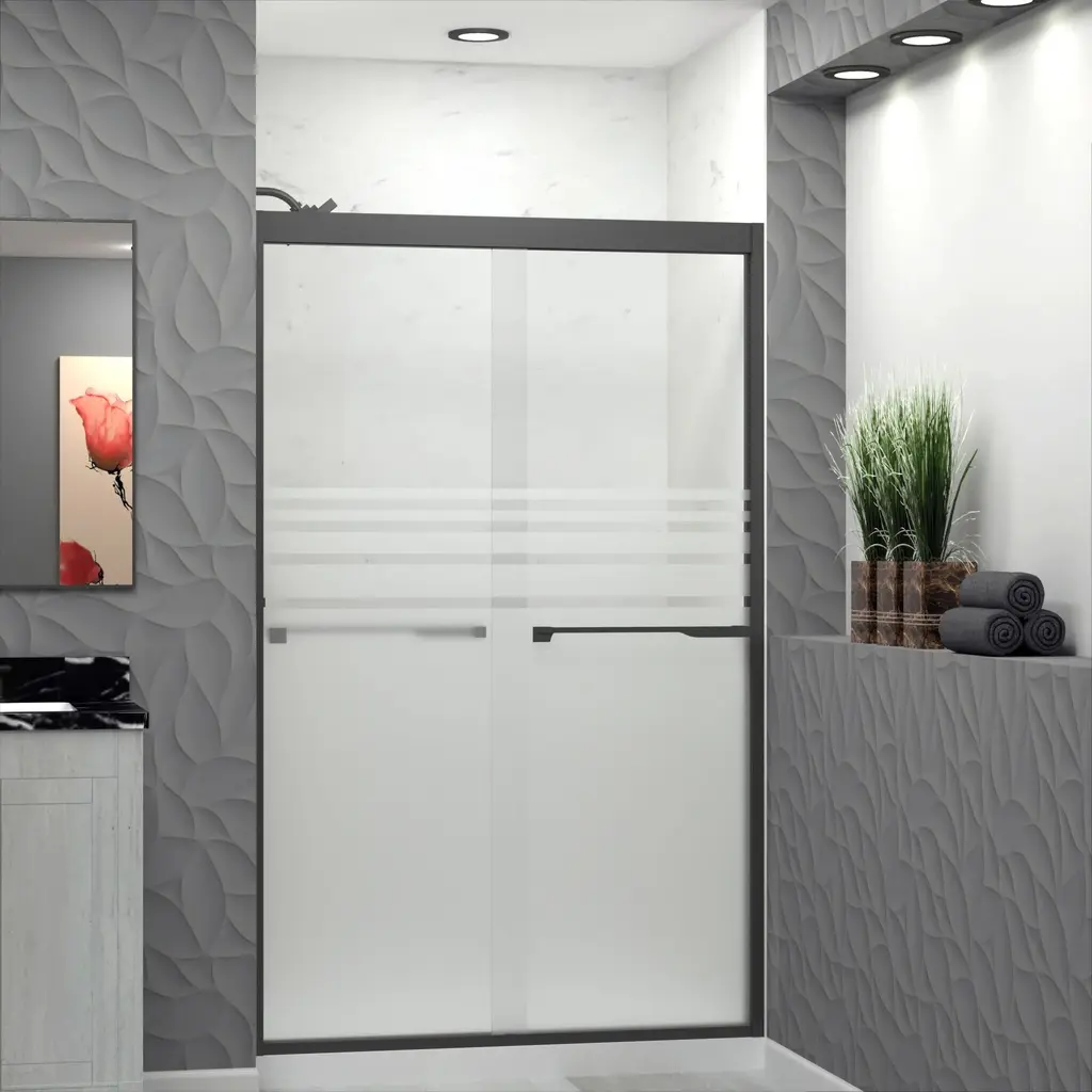 The Transolid Frederick Semi-Frameless By-Pass Shower Door Collection combines the practicality of a space saving design with custom quality craftsmanship. The collection features thick, premium 5/16 in. (8mm) frosted tempered glass with professionally applied Nano Frosted glass coating, which provides superior dirt and water repellant and stain resistant benefits. TruMotion® technology makes our shower doors close softly and effortlessly no matter how hard you slam them or how heavy they are and the Frederick door provides up to 2/5 in. of out-of-plumb adjustability on each side to provide a watertight fit in your alcove. The Frederick Door is available in a wide array of width and height options with several desirable hardware finish options to match your bathroom's interior design and layout perfectly. Built for an alcove (3-wall) shower enclosure, sliding glass shower doors can be opened from left or right with its full by-pass (both panels slide) design. 20 in. (500 mm from center to center) sliding shower door handles also function as towel bars, providing handy storage space for a folded bath towel or two hand towels. Multiple Transolid handle options are available, but this combination features the rustic Justin handles. The Justin handles are part of the Diamond series and feature a unique, high-end design, adding a distinctive look to your Frederick shower door. These handles are substantial in weight and are every bit as functional as they are beautiful. Look for the matching grab bar to complete the look!Transolid FBPT487608F-J Features:Overall Height: 76" (bottom to top of door fixture)