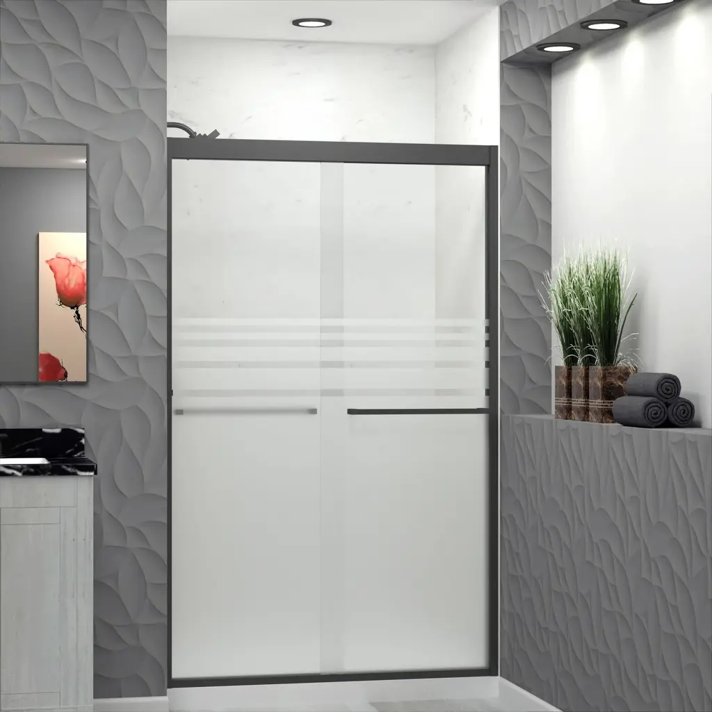 The Transolid Frederick Semi-Frameless By-Pass Shower Door Collection combines the practicality of a space saving design with custom quality craftsmanship. The collection features thick, premium 5/16 in. (8mm) frosted tempered glass with professionally applied Nano Frosted glass coating, which provides superior dirt and water repellant and stain resistant benefits. TruMotion® technology makes our shower doors close softly and effortlessly no matter how hard you slam them or how heavy they are and the Frederick door provides up to 2/5 in. of out-of-plumb adjustability on each side to provide a watertight fit in your alcove. The Frederick Door is available in a wide array of width and height options with several desirable hardware finish options to match your bathroom's interior design and layout perfectly. Built for an alcove (3-wall) shower enclosure, sliding glass shower doors can be opened from left or right with its full by-pass (both panels slide) design. 20 in. (500 mm from center to center) sliding shower door handles also function as towel bars, providing handy storage space for a folded bath towel or two hand towels. Multiple Transolid handle options are available, but this combination features the modern Sabrina handles. The Sabrina handles are part of the Meridian series and feature a unique, high-end design, adding a distinctive look to your Frederick shower door. These handles are substantial in weight and are every bit as functional as they are beautiful. Look for the matching grab bar to complete the look!Transolid FBPT487608F-S Features:Overall Height: 76" (bottom to top of door fixture)