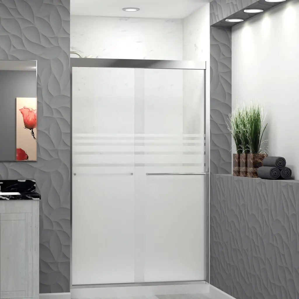 The Transolid Frederick Semi-Frameless By-Pass Shower Door Collection combines the practicality of a space saving design with custom quality craftsmanship. The collection features thick, premium 5/16 in. (8mm) frosted tempered glass with professionally applied Nano Frosted glass coating, which provides superior dirt and water repellant and stain resistant benefits. TruMotion® technology makes our shower doors close softly and effortlessly no matter how hard you slam them or how heavy they are and the Frederick door provides up to 2/5 in. of out-of-plumb adjustability on each side to provide a watertight fit in your alcove. The Frederick Door is available in a wide array of width and height options with several desirable hardware finish options to match your bathroom's interior design and layout perfectly. Built for an alcove (3-wall) shower enclosure, sliding glass shower doors can be opened from left or right with its full by-pass (both panels slide) design. 20 in. (500 mm from center to center) sliding shower door handles also function as towel bars, providing handy storage space for a folded bath towel or two hand towels. Multiple Transolid handle options are available, but this combination features the traditional Turin handles. The Turin handles are part of the Meridian series and feature a unique, high-end design, adding a distinctive look to your Frederick shower door. These handles are substantial in weight and are every bit as functional as they are beautiful. Look for the matching grab bar to complete the look!Transolid FBPT487608F-T Features:Overall Height: 76" (bottom to top of door fixture)