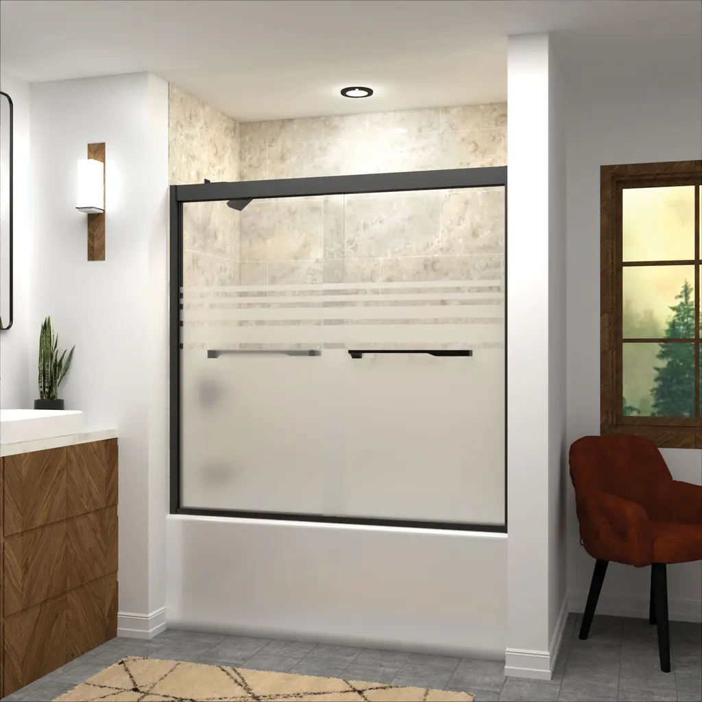 The Transolid Frederick Semi-Frameless By-Pass Shower Door Collection combines the practicality of a space saving design with custom quality craftsmanship. The collection features thick, premium 5/16 in. (8mm) frosted tempered glass with professionally applied Nano Frosted glass coating, which provides superior dirt and water repellant and stain resistant benefits. TruMotion® technology makes our shower doors close softly and effortlessly no matter how hard you slam them or how heavy they are and the Frederick door provides up to 2/5 in. of out-of-plumb adjustability on each side to provide a watertight fit in your alcove. The Frederick Door is available in a wide array of width and height options with several desirable hardware finish options to match your bathroom's interior design and layout perfectly. Built for an alcove (3-wall) shower enclosure, sliding glass shower doors can be opened from left or right with its full by-pass (both panels slide) design. 20 in. (500 mm from center to center) sliding shower door handles also function as towel bars, providing handy storage space for a folded bath towel or two hand towels. Multiple Transolid handle options are available, but this combination features the rustic Justin handles. The Justin handles are part of the Diamond series and feature a unique, high-end design, adding a distinctive look to your Frederick shower door. These handles are substantial in weight and are every bit as functional as they are beautiful. Look for the matching grab bar to complete the look!Transolid FBPT605808F-J Features:Overall Height: 58" (bottom to top of door fixture)