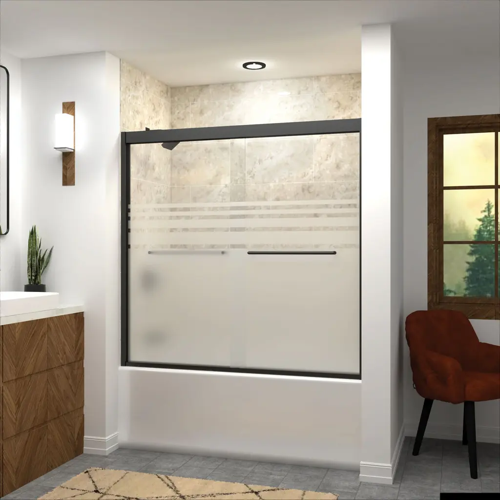 The Transolid Frederick Semi-Frameless By-Pass Shower Door Collection combines the practicality of a space saving design with custom quality craftsmanship. The collection features thick, premium 5/16 in. (8mm) frosted tempered glass with professionally applied Nano Frosted glass coating, which provides superior dirt and water repellant and stain resistant benefits. TruMotion® technology makes our shower doors close softly and effortlessly no matter how hard you slam them or how heavy they are and the Frederick door provides up to 2/5 in. of out-of-plumb adjustability on each side to provide a watertight fit in your alcove. The Frederick Door is available in a wide array of width and height options with several desirable hardware finish options to match your bathroom's interior design and layout perfectly. Built for an alcove (3-wall) shower enclosure, sliding glass shower doors can be opened from left or right with its full by-pass (both panels slide) design. 20 in. (500 mm from center to center) sliding shower door handles also function as towel bars, providing handy storage space for a folded bath towel or two hand towels. Multiple Transolid handle options are available, but this combination features the traditional Turin handles. The Turin handles are part of the Meridian series and feature a unique, high-end design, adding a distinctive look to your Frederick shower door. These handles are substantial in weight and are every bit as functional as they are beautiful. Look for the matching grab bar to complete the look!Transolid FBPT605808F-T Features:Overall Height: 58" (bottom to top of door fixture)