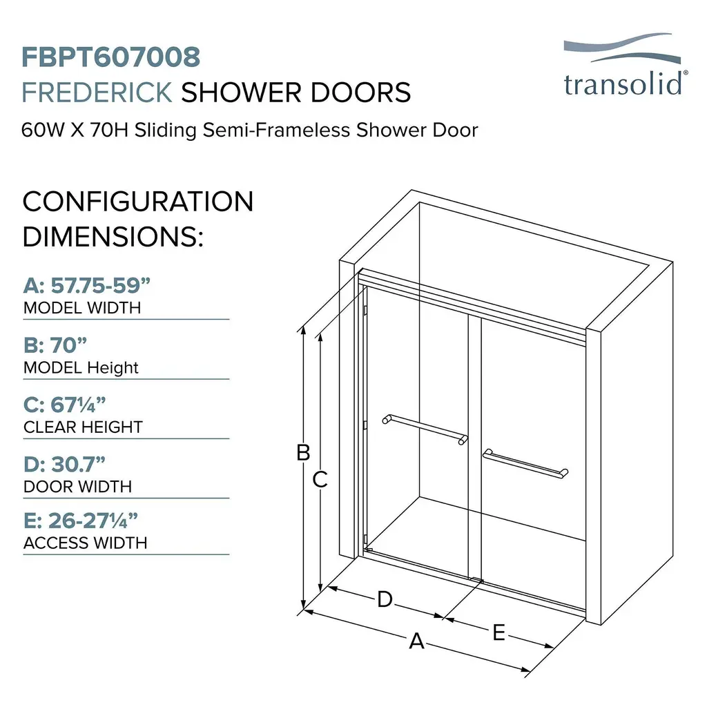 The Transolid Frederick Semi-Frameless By-Pass Shower Door Collection combines the practicality of a space saving design with custom quality craftsmanship. The collection features thick, premium 5/16 in. (8mm) clear tempered glass with professionally applied Nano clear glass coating, which provides superior dirt and water repellant and stain resistant benefits. TruMotion® technology makes our shower doors close softly and effortlessly no matter how hard you slam them or how heavy they are and the Frederick door provides up to 2/5 in. of out-of-plumb adjustability on each side to provide a watertight fit in your alcove. The Frederick Door is available in a wide array of width and height options with several desirable hardware finish options to match your bathroom's interior design and layout perfectly. Built for an alcove (3-wall) shower enclosure, sliding glass shower doors can be opened from left or right with its full by-pass (both panels slide) design. 20 in. (500 mm from center to center) sliding shower door handles also function as towel bars, providing handy storage space for a folded bath towel or two hand towels. Multiple Transolid handle options are available, but this combination features the modern Sabrina handles. The Sabrina handles are part of the Meridian series and feature a unique, high-end design, adding a distinctive look to your Frederick shower door. These handles are substantial in weight and are every bit as functional as they are beautiful. Look for the matching grab bar to complete the look!Transolid FBPT607008C-S Features: