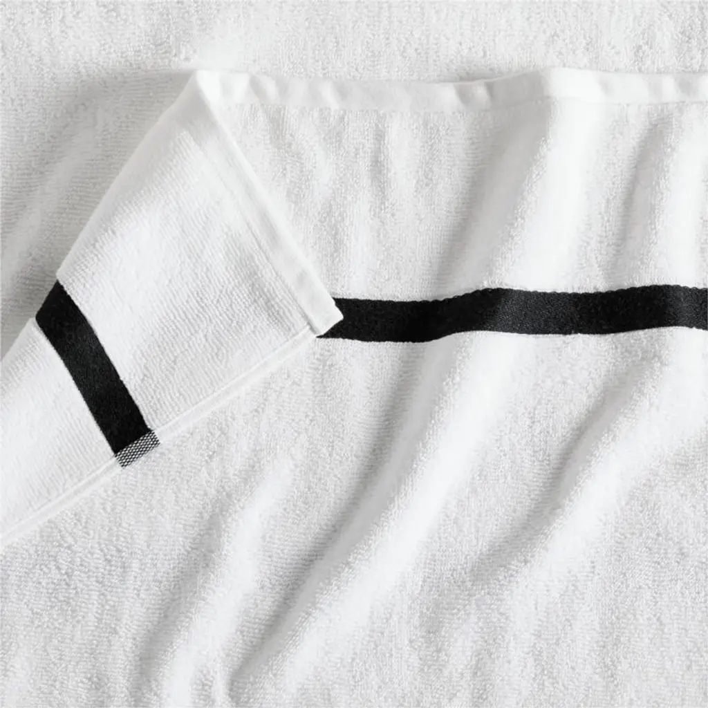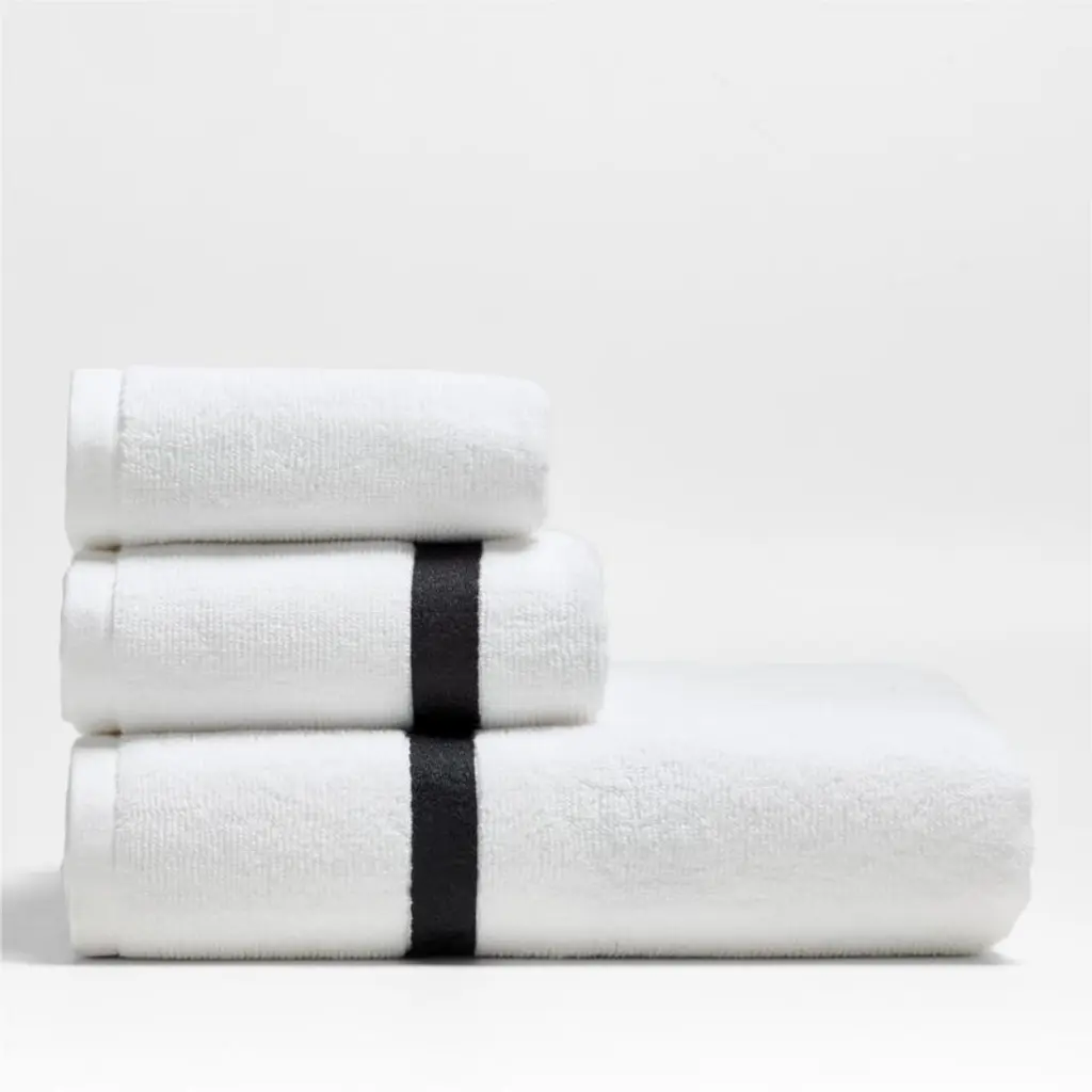 Our tuxedo towel collection dresses up your bathroom for a chic and put-together look. Inspired by timeless formal wear, two black embroidered stripes detail this organic cotton hand towel. Inky embroidery contrasts with the bright white, densely looped terrycloth for an indulgent towel that looks sophisticated and feels irresistibly soft and absorbent. Pair with the coordinating bath mat, bath towel and washcloth for an impeccably tailored and always-in-style bathroom.