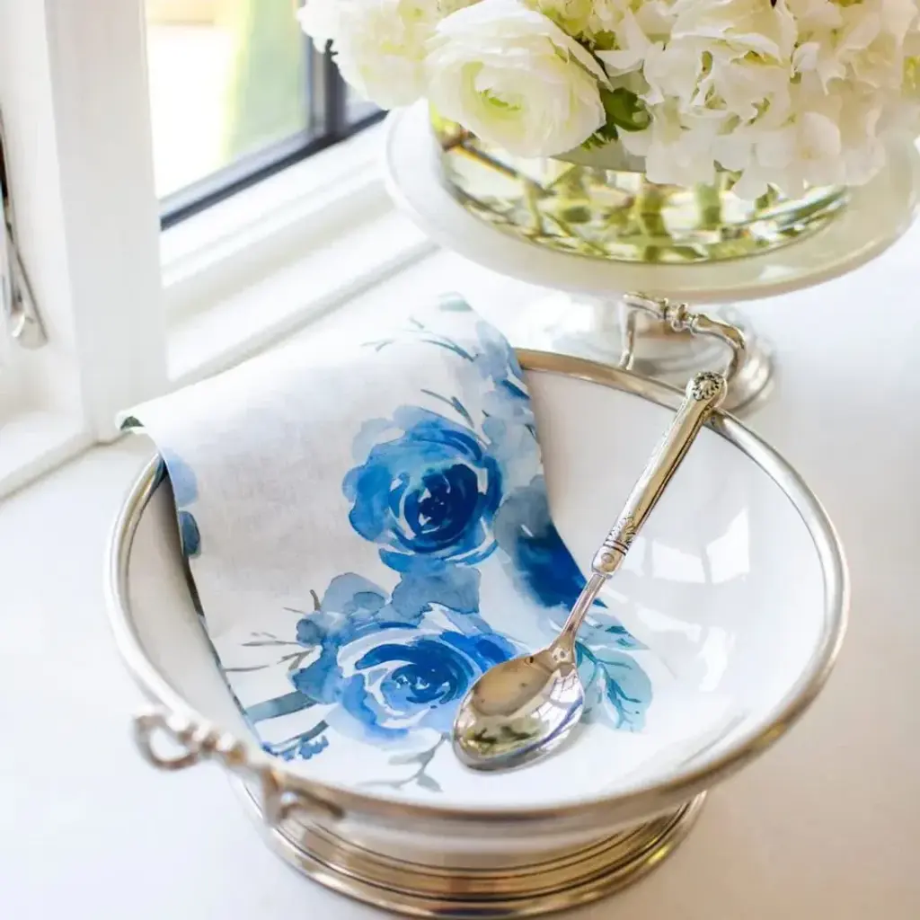 Watercolor Blue Floral, Italian Linen 19.5" X 29" Linen Hand Towel