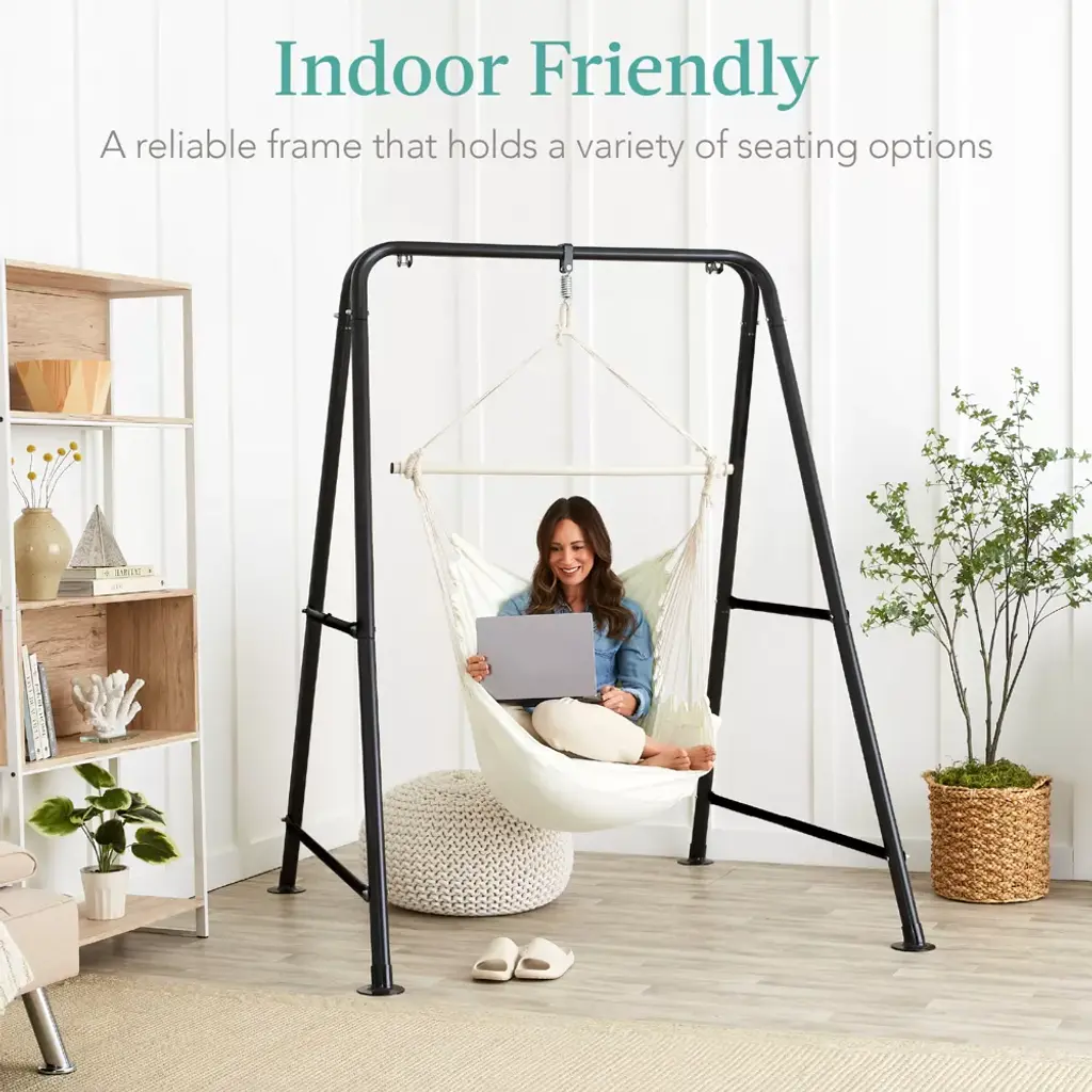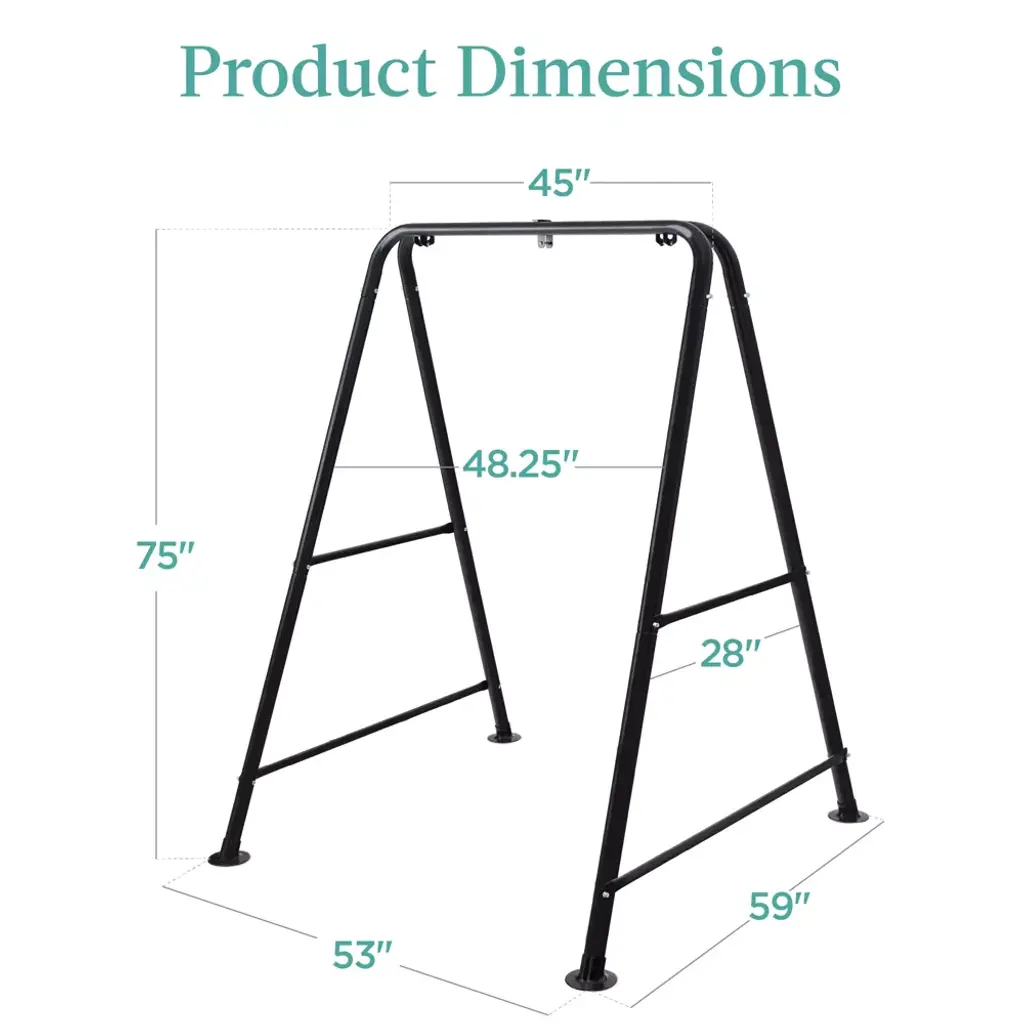 When you say you're "hanging around the house," say it like you mean it! This Heavy-Duty Hammock stand uses included hardware to fit a variety of hanging seat options. A set of spring hooks, locking carabiners, and 47inch mounting chains serve as essential tools to help you find the perfect set up for your favorite suspended seat. Made from solid, powder-coated steel, this stand a welcome addition indoors or outside. Add a dynamic seating element to your favorite part of the home, or use it to reinvent an underused one.The following section is provided to replicate any text that is present on the images in order to ensure the information is equally accessible to all guests.Outdoor Friendly Built to support your favorite seats throughout the seasonsIndoor Friendly A reliable frame that holds a variety of seating optionsHeavy-Duty Design Built extra tall and wide to support a variety of hanging chairs and swings 350lb Capacity 4 Support Bars Easy Assembly Non-Slip FeetChoose Your Seat! Macrame Chair Sensory Swing Hammock Chair *Chair Options Not IncludedHanging Hardware Spring Hooks Expand and contract to create a smooth, gliding motion Locking Carabiners Helps connect and secure your seat to the frame 47in Mounting Chain Adjustable chains help your seat rest at the ideal heightProduct Dimensions Overall Dimensions: 59"(L) x 53"(W) x 75"(H) Upper Bar: 45" Hanging Section Width: 48.25" Middle Support Bar: 28"