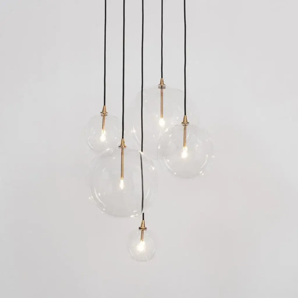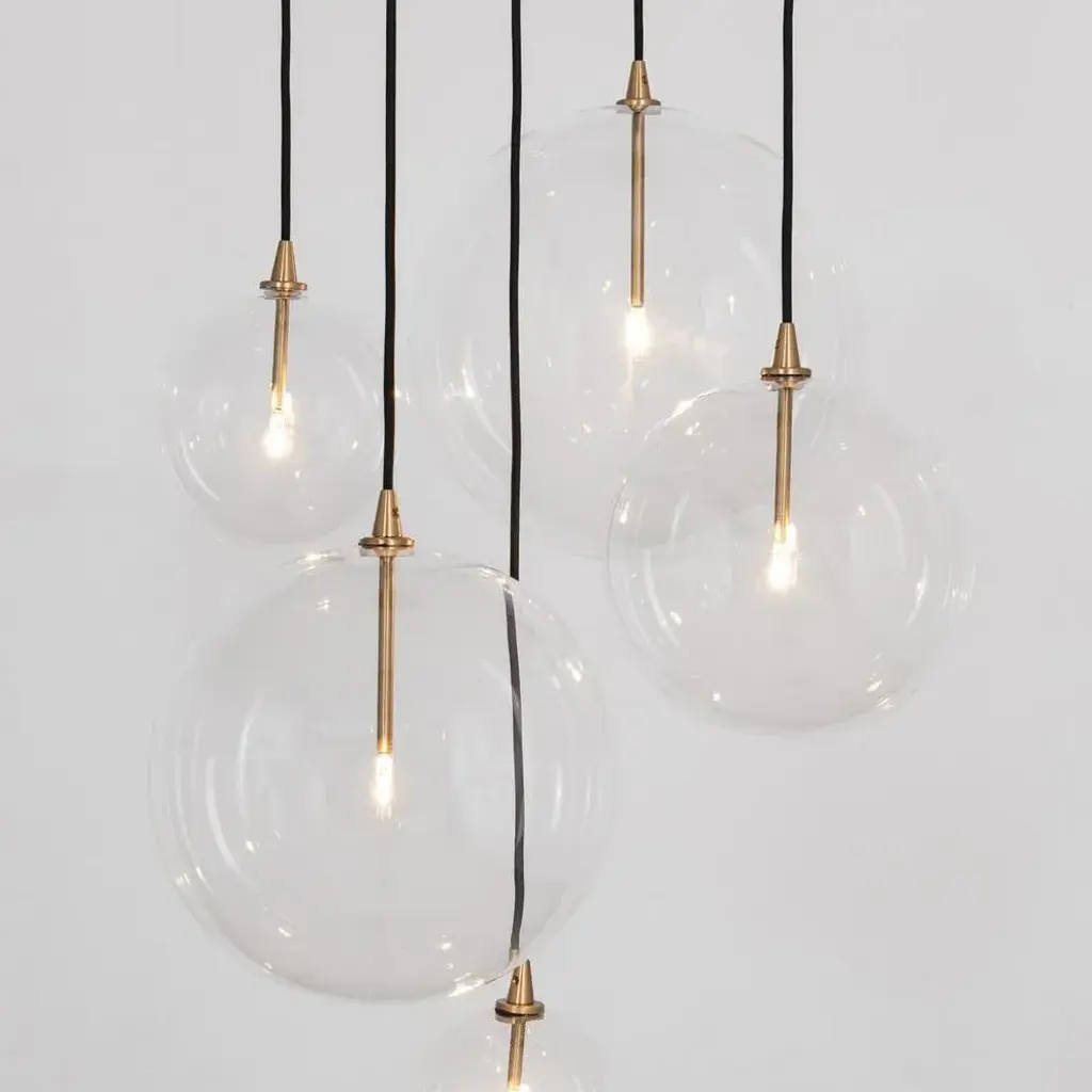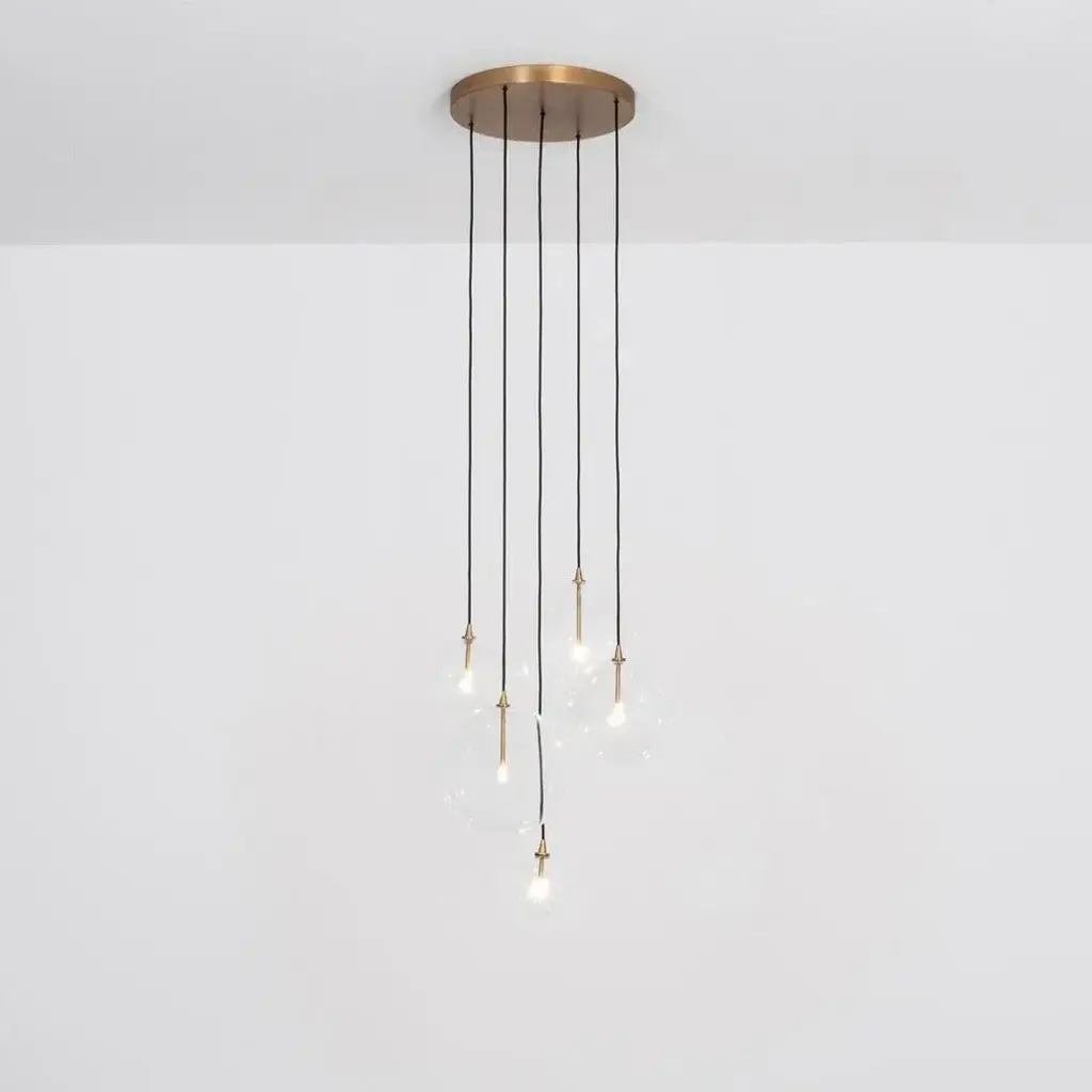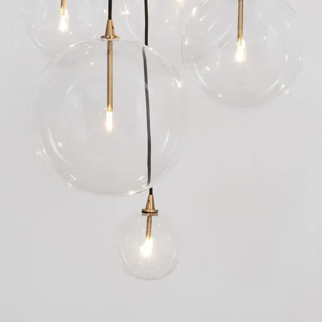 Cluster 5 mix chandelier in solid brass by schwung dimensions: w 62 x d 72 x h 315 cm materials: natural brass, hand blown glass globes ceiling plate diameter 45cm / h 4.5 cm glass globes diameter 35 / 30 / 25 / 20 / 15 cm max qty of bulbs 5 max wattage 1.6w bulb base g4, 12v ac lumens 1000lm colour temperature 2700k maximum bulb diameter 10mm dimmable with electronic (elv, trailing edge) dimmers only schwung is a german word, and loosely defined, means energy or momentumm of a positive manner. Synonyms: verve, zest, panache, momentum. Mission developing lighting fixtures through simple and timeless materials, sustainably; we are committed to creating quality products that last. Beginning with the design we are constantly refining aesthetic and function. Both in the lamps themselves and throughout the manufacturing process we pursue a holistic approach to efficiency, and the reduction of environmental impact. Concept schwung is a lighting concept, connecting aesthetic and quality through matter. An exploration of history, forms and function, elegantly fulfilling an essential need of modern life, capturing light. Our pieces play with architecture or create spaces of their own. up to 250v (europe/uk standard).
