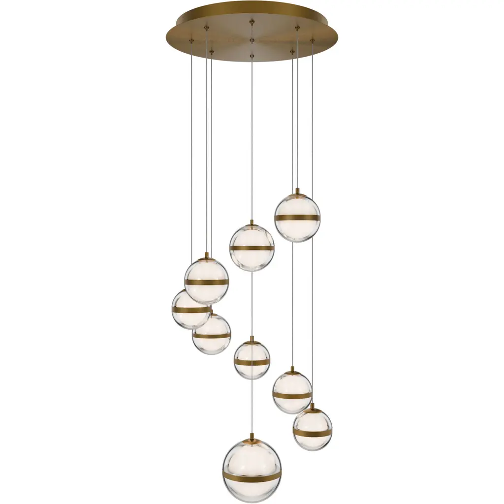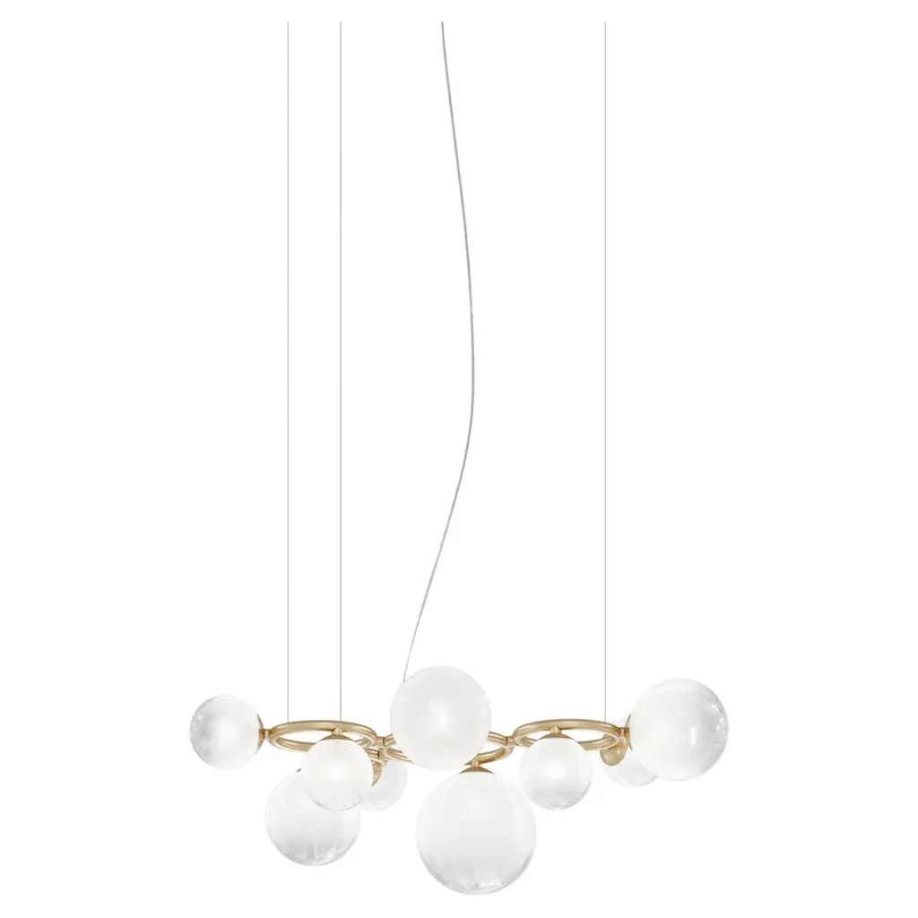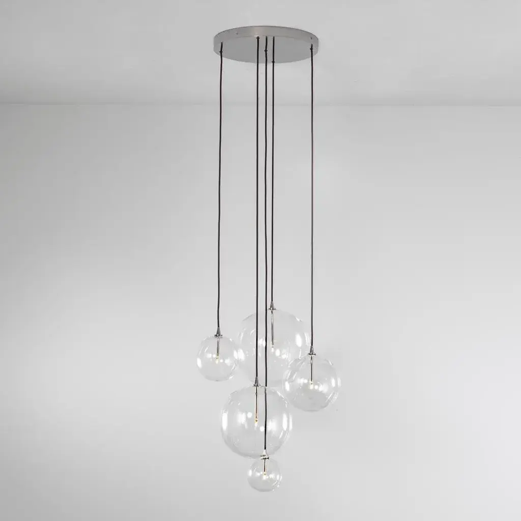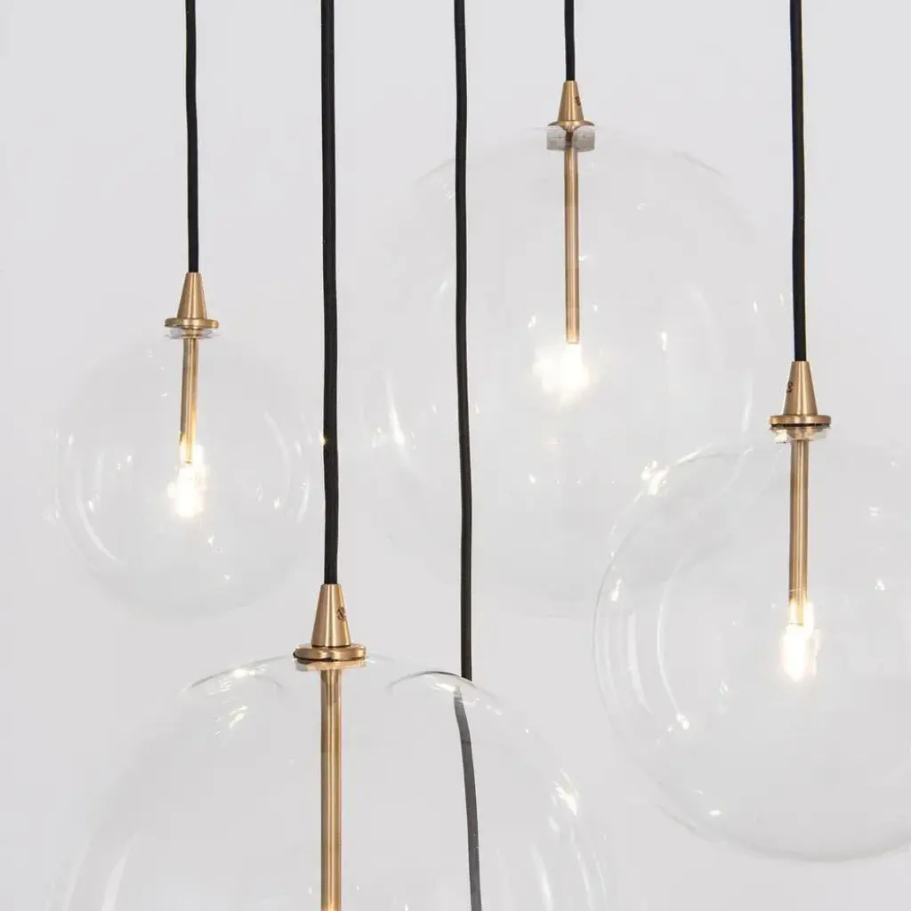 Cluster 5 mix chandelier in solid brass by schwung dimensions: w 62 x d 72 x h 315 cm materials: natural brass, hand blown glass globes ceiling plate diameter 45cm / h 4.5 cm glass globes diameter 35 / 30 / 25 / 20 / 15 cm max qty of bulbs 5 max wattage 1.6w bulb base g4, 12v ac lumens 1000lm colour temperature 2700k maximum bulb diameter 10mm dimmable with electronic (elv, trailing edge) dimmers only schwung is a german word, and loosely defined, means energy or momentumm of a positive manner. Synonyms: verve, zest, panache, momentum. Mission developing lighting fixtures through simple and timeless materials, sustainably; we are committed to creating quality products that last. Beginning with the design we are constantly refining aesthetic and function. Both in the lamps themselves and throughout the manufacturing process we pursue a holistic approach to efficiency, and the reduction of environmental impact. Concept schwung is a lighting concept, connecting aesthetic and quality through matter. An exploration of history, forms and function, elegantly fulfilling an essential need of modern life, capturing light. Our pieces play with architecture or create spaces of their own. up to 250v (europe/uk standard).