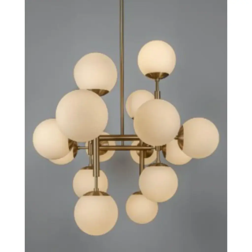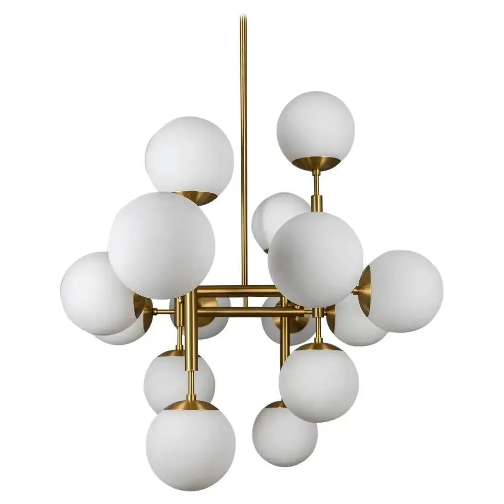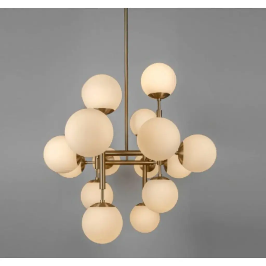 Riegel chandelier by Schwung Dimensions: D 175.8 x H 199 cm Materials: brass, opal glass Weight: 31.2 kg Schwung is a german word, and loosely defined, means energy or momentumm of a positive manner. synonyms: verve, zest, panache, momentum. Mission Developing lighting fixtures through simple and timeless materials, sustainably; We are committed to creating quality products that last. Beginning with the design we are constantly refining aesthetic and function. Both in the lamps themselves and throughout the manufacturing process we pursue a holistic approach to efficiency, and the reduction of environmental impact. Concept Schwung is a lighting concept, connecting aesthetic and quality through matter. An exploration of history, forms and function, elegantly fulfilling an essential need of modern life, capturing light. Our pieces play with architecture or create spaces of their own. Up to 250V (Europe/UK Standard).