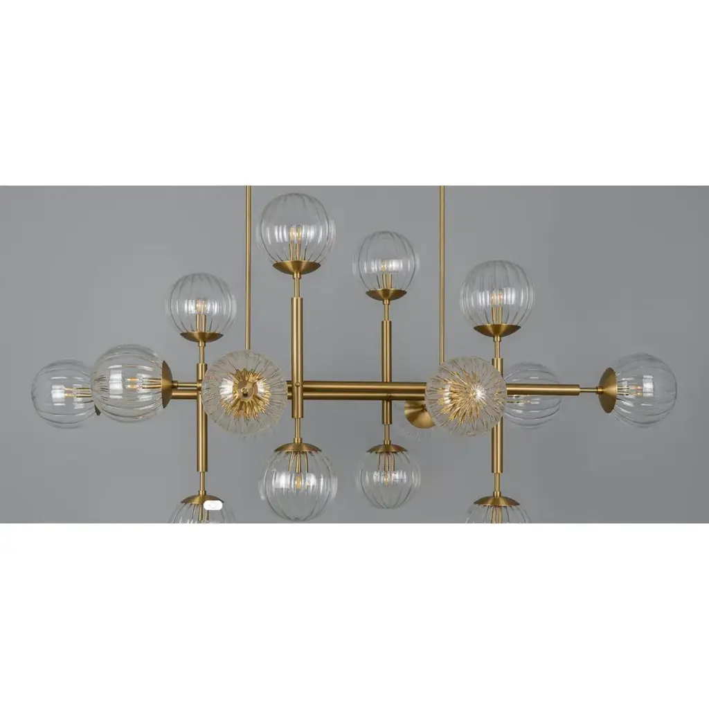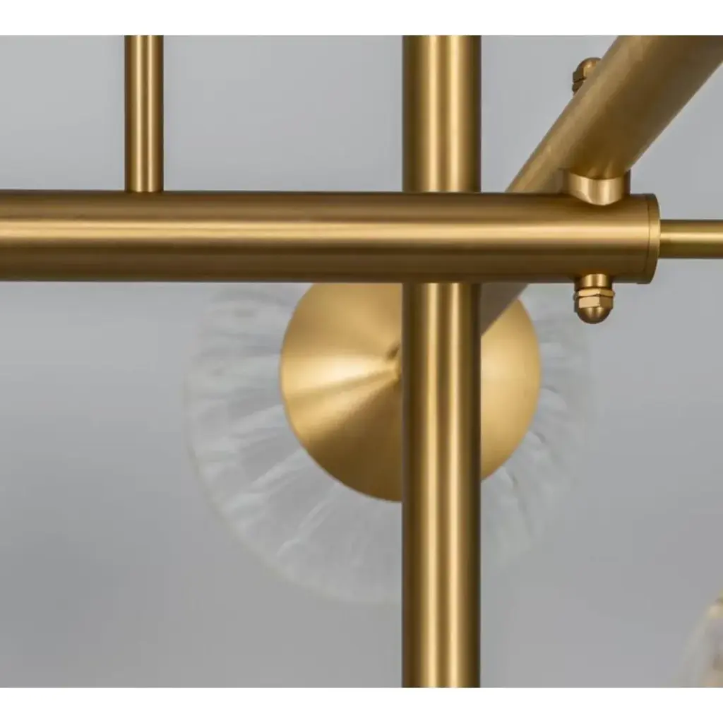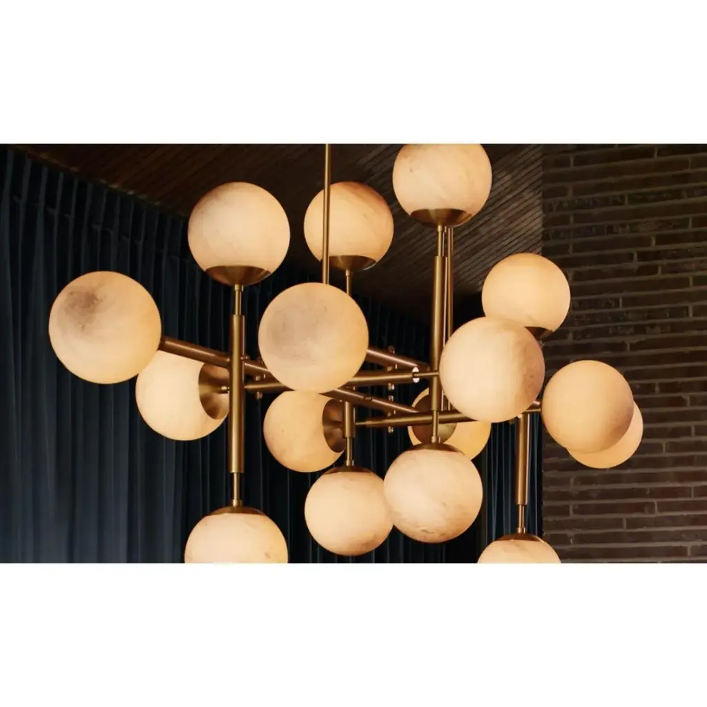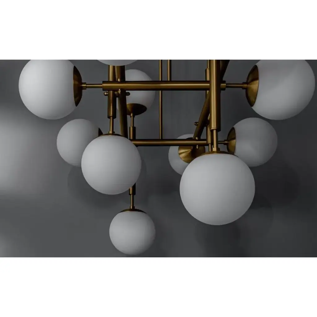 Riegel chandelier by Schwung Dimensions: D 175.8 x H 199 cm Materials: brass, opal glass Weight: 31.2 kg Schwung is a german word, and loosely defined, means energy or momentumm of a positive manner. synonyms: verve, zest, panache, momentum. Mission Developing lighting fixtures through simple and timeless materials, sustainably; We are committed to creating quality products that last. Beginning with the design we are constantly refining aesthetic and function. Both in the lamps themselves and throughout the manufacturing process we pursue a holistic approach to efficiency, and the reduction of environmental impact. Concept Schwung is a lighting concept, connecting aesthetic and quality through matter. An exploration of history, forms and function, elegantly fulfilling an essential need of modern life, capturing light. Our pieces play with architecture or create spaces of their own. Up to 250V (Europe/UK Standard).
