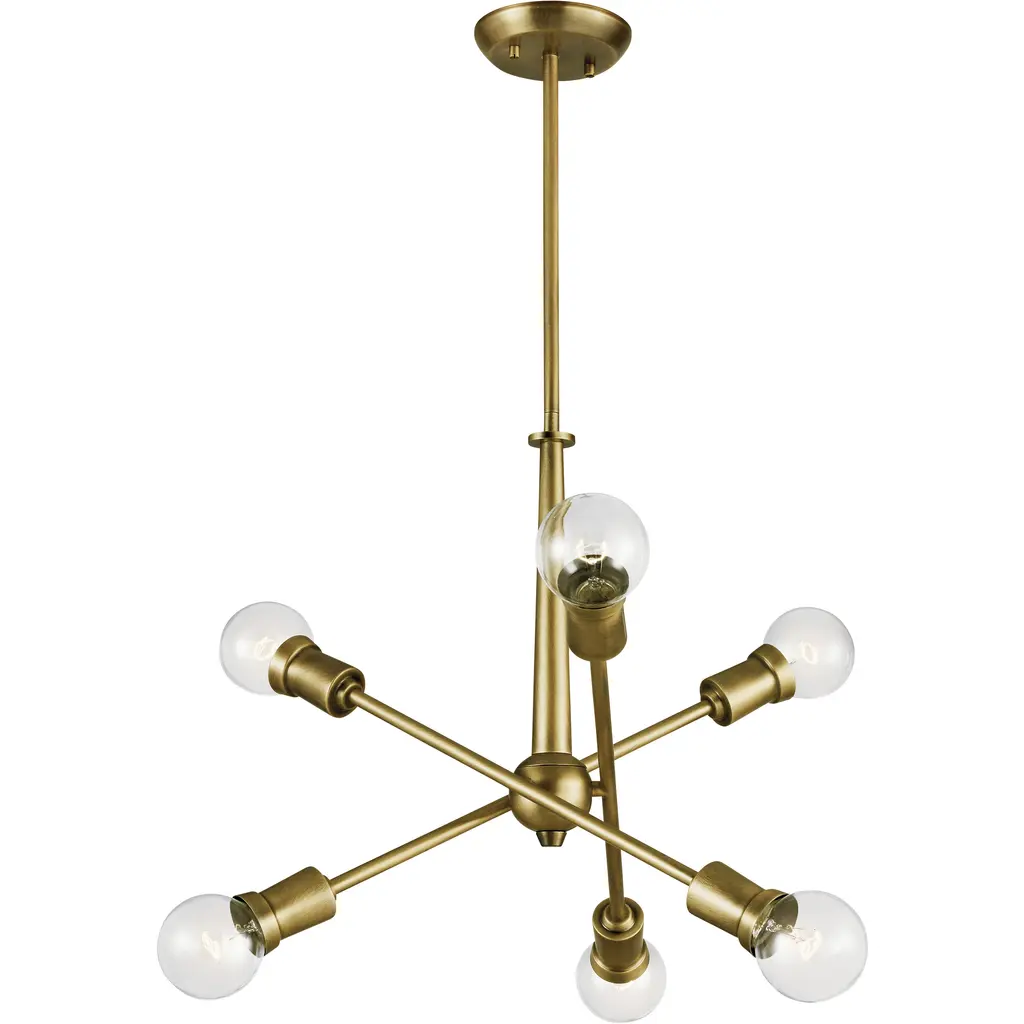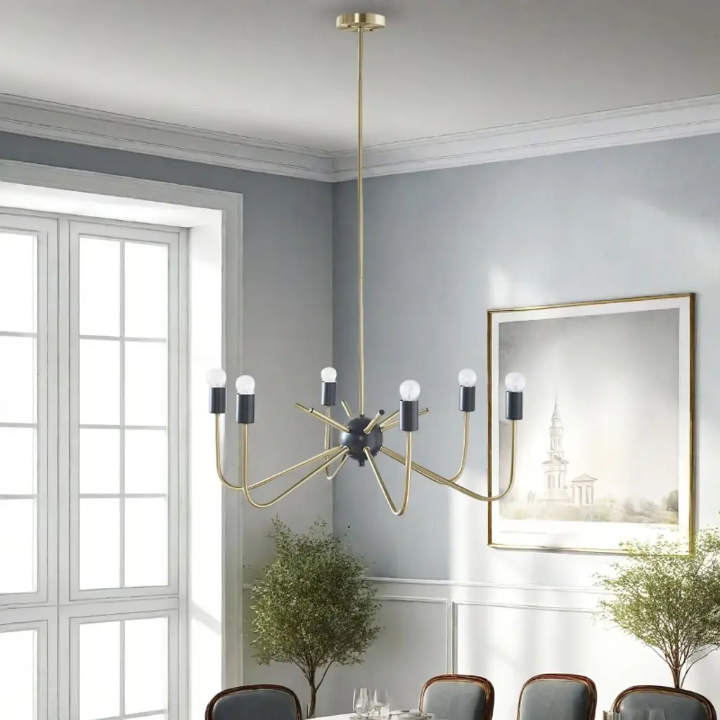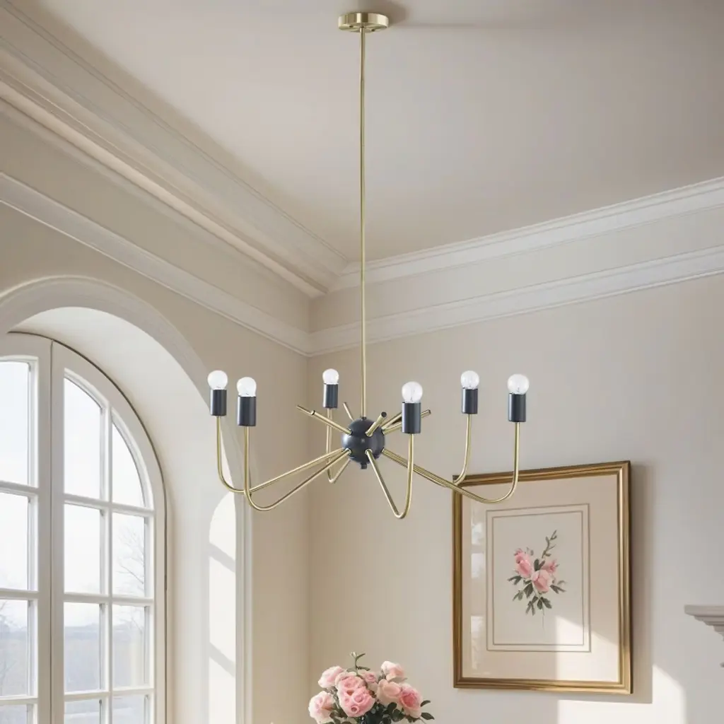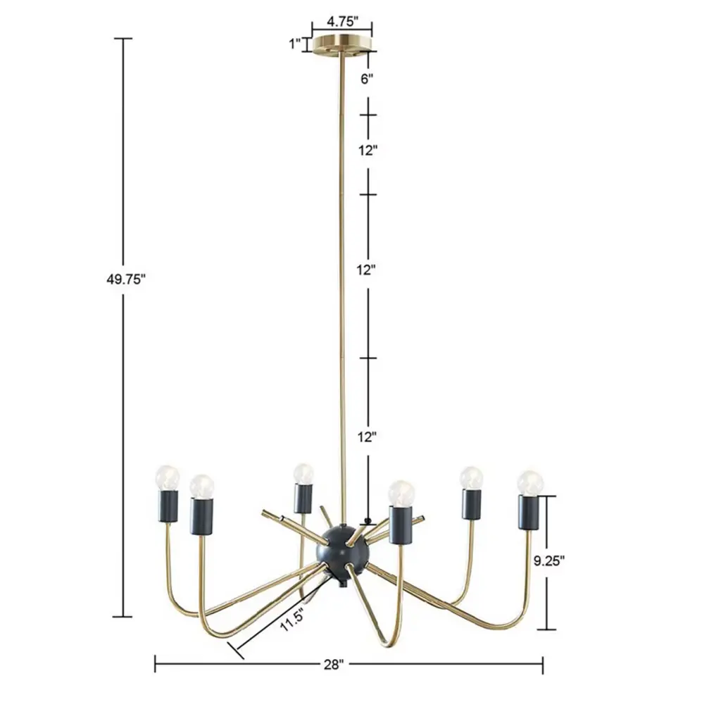 Add a modern design element to your kitchen or dining room with the Hampton Hill Alexis 6-Light Metal Chandelier. The two-tone antique brass and black finish features 6 angular curved metal rods that create a striking visual impact. The adjustable height (19"-49") and sophisticated metalwork make this fixture a stylish focal point, while the included mounting hardware ensures professional-grade installation on standard ceilings. (Designed for use with six Type A bulbs, not included.)