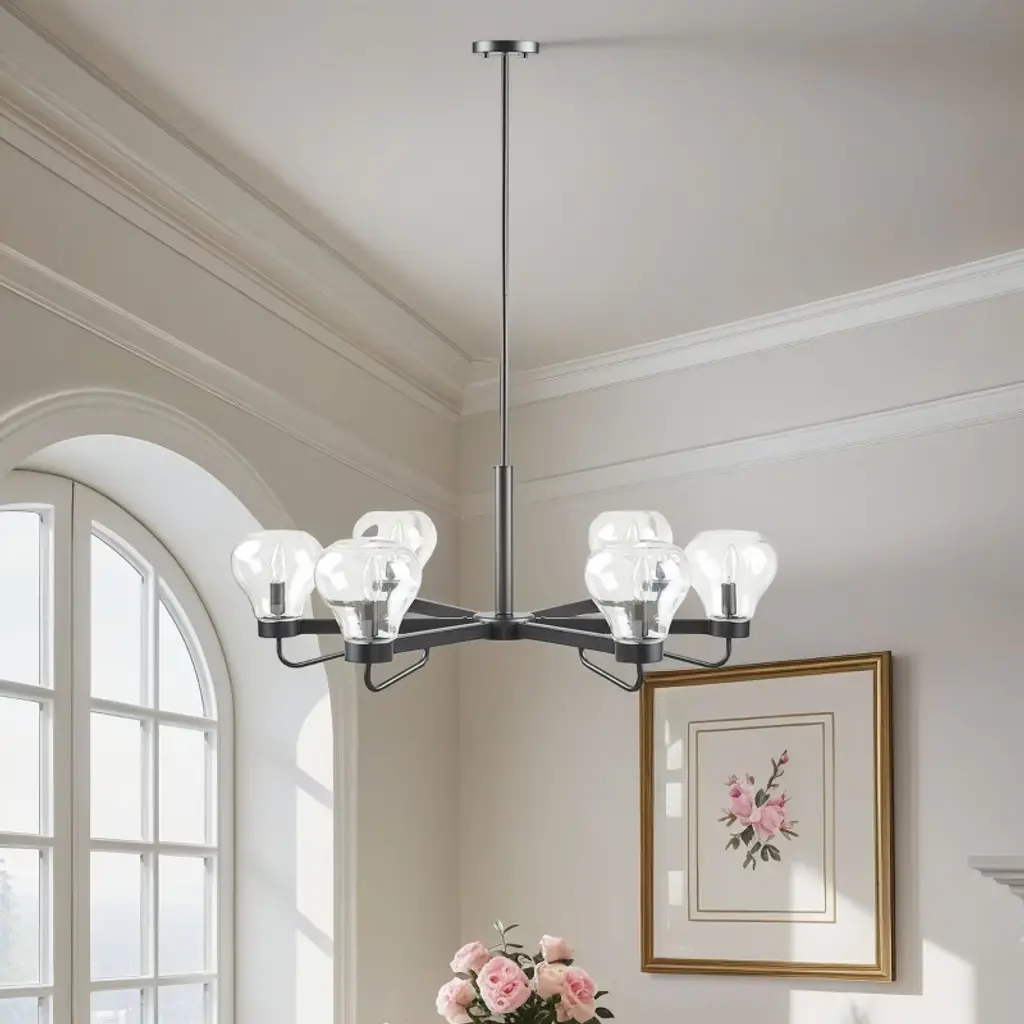 Elevate your space with this classic black 6-light chandelier featuring distinctive clear bowl-shaped shades. The adjustable 4-piece rod system (14.75"-54.5" height range) allows for perfect customization, while the black metal finish and clear glass design create a timeless blend of traditional and modern style. Includes all necessary mounting hardware for professional installation (indoor use only, not compatible with sloped ceilings).