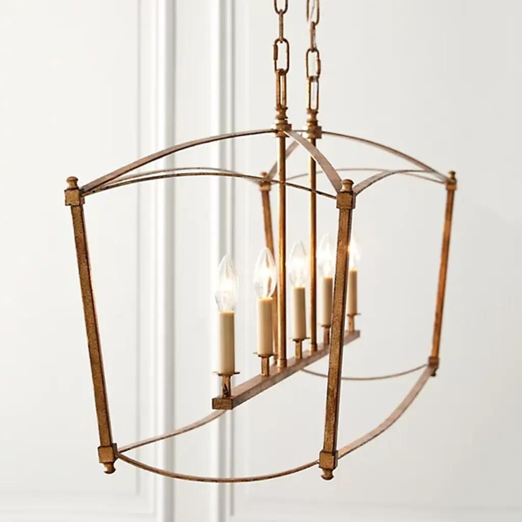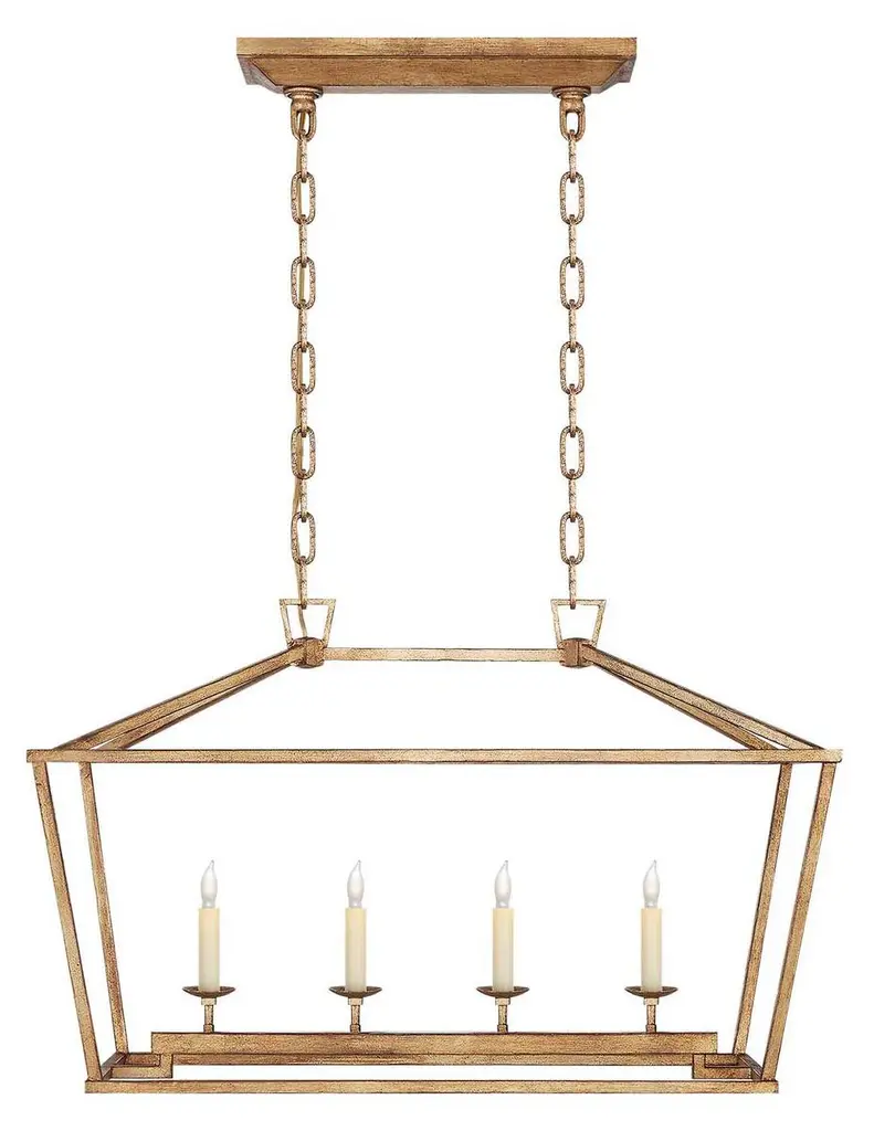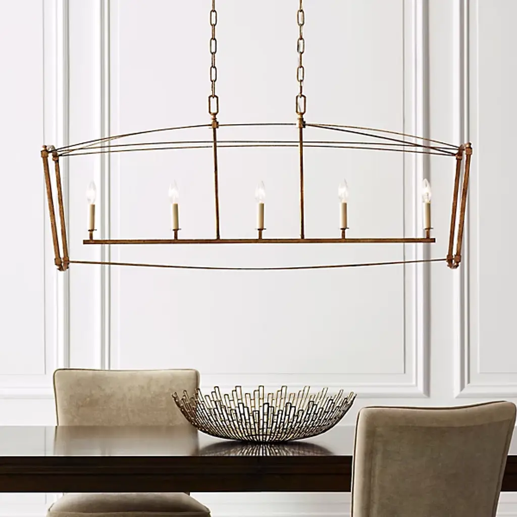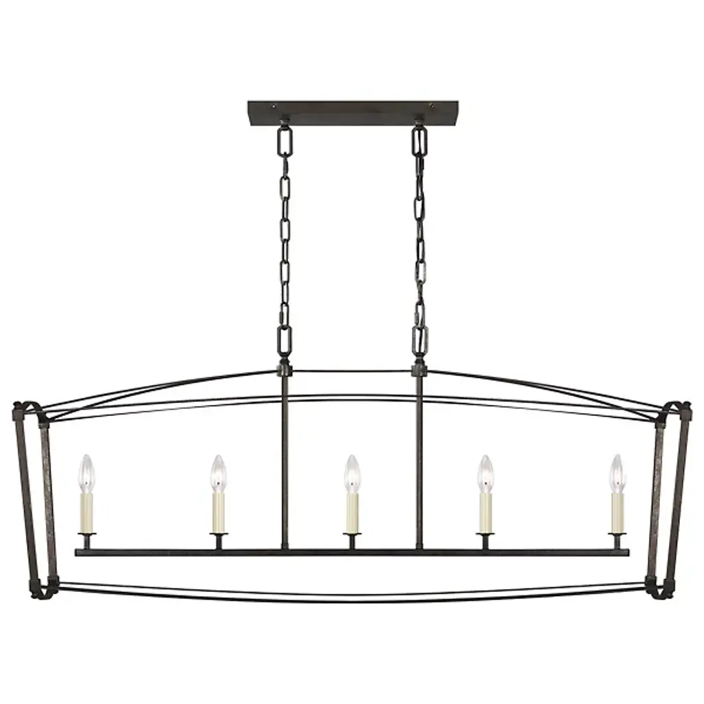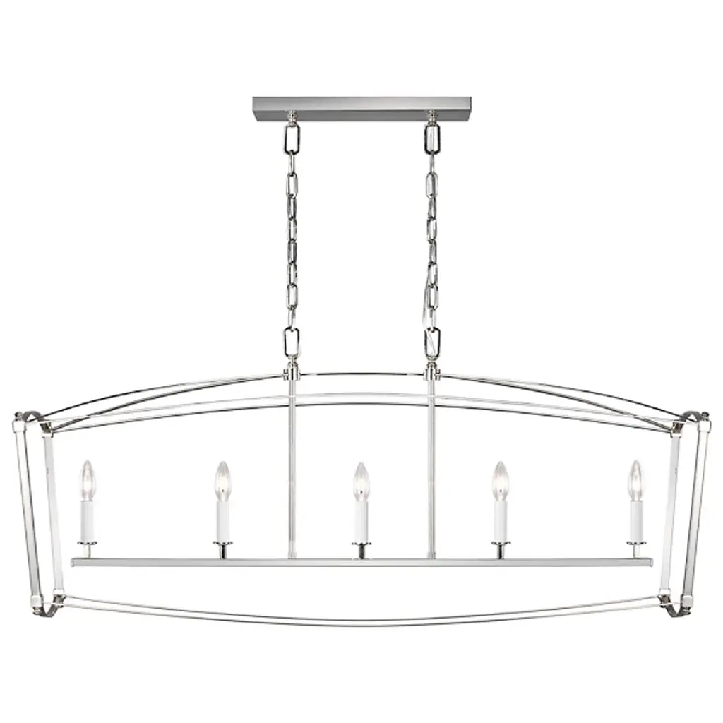 Sophisticated and streamlined. The Thayer 5 Light Linear Chandelier by Visual Comfort Studio, formerly known as Sean Lavin, is a traditional-looking light fixture that will bring elegance to living rooms or dining rooms alike. Constructed from Steel, this product will last for a long time, providing high-quality light. A central rod holds several candelabras for an old-fashioned look like chandeliers that used actual candles. It features gentle curves to give it a soft appearance, and the whole thing hangs from two chains from a ceiling canopy.