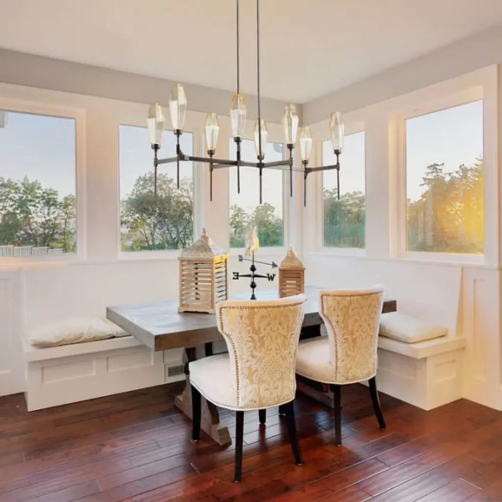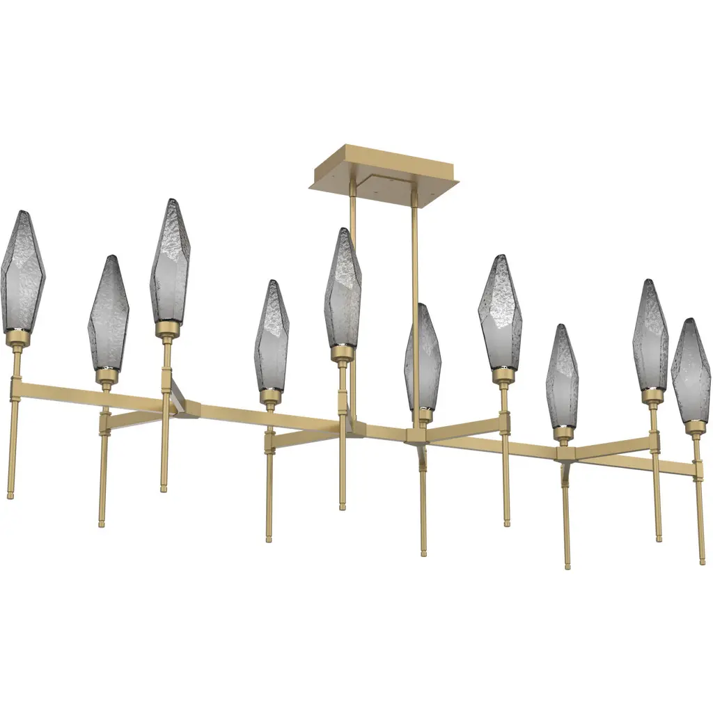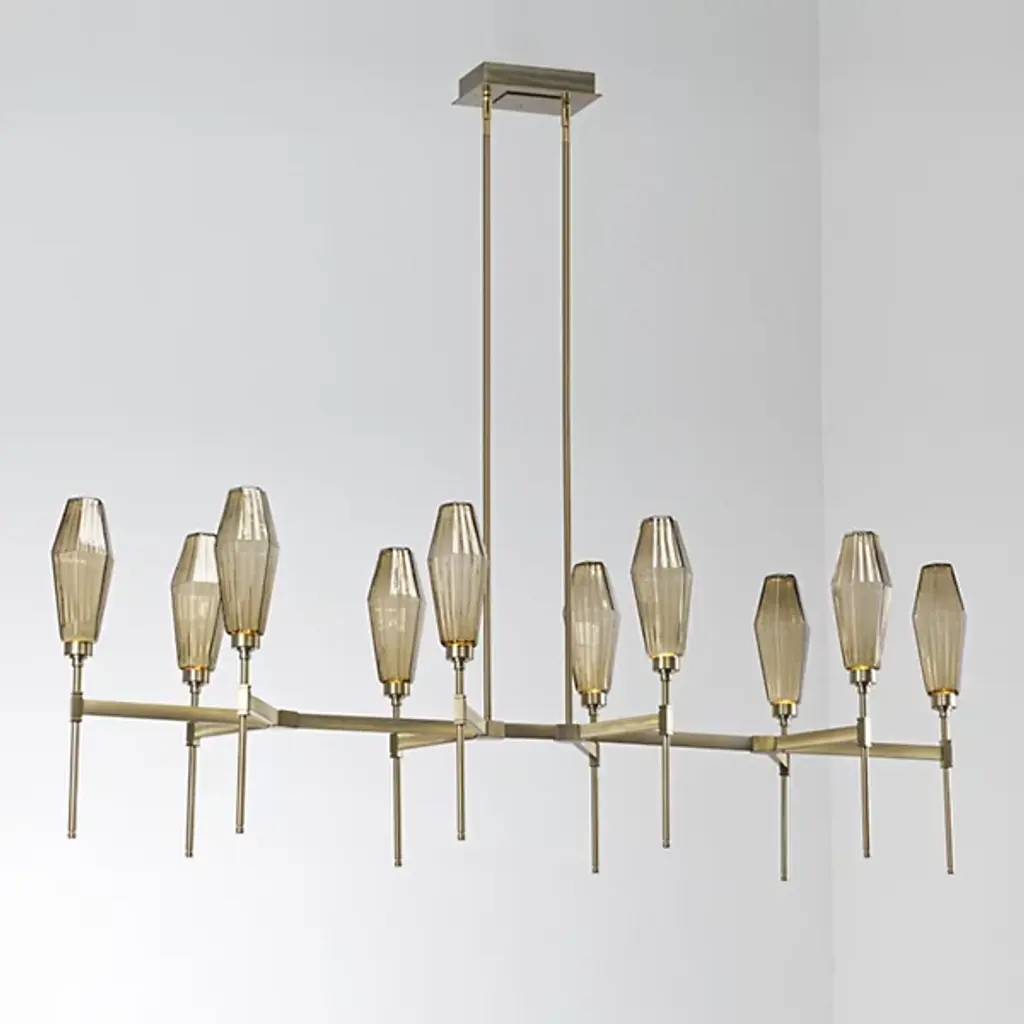 A bountiful display of elegance. The Aalto Large Linear Suspension from Hammerton Studio spans over dining tables in a classy silhouette marked by elegant geometry. Its metal framework produces a staggering array of contours radiating with dynamic angles. Fine metal stems pierce elegantly through the structure, creating an uplifting accent. Its handblown glass shades invite you to lose yourself in the myriad of artistic detail along its surfaces. Flip the switch and realize the elegance of your dining room as an elaborate glow permeates through the air.