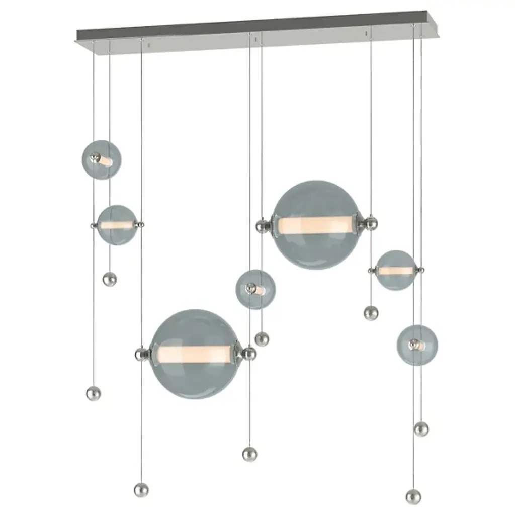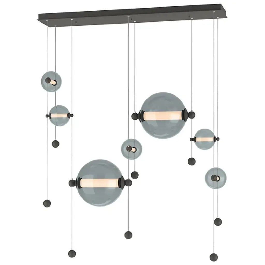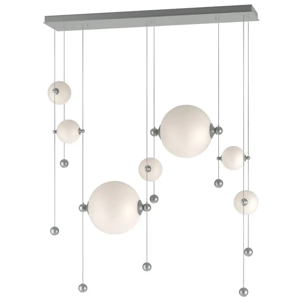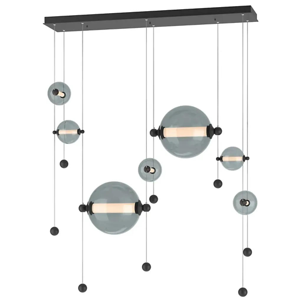 The Abacus Double LED Linear Suspension by Hubbardton Forge demands attention through its crisp, eye-catching design. This dynamic fixture is unique in its ability to be adjusted vertically, with its blown glass orbs set along slender cables that drop from a shared rectangular canopy. The orbs vary in size and direction and can be moved up or down the cables via threaded fasteners on either end. LEDs create a glowing beam within each shade while globe-shaped weights surround the lights at the end of each cable.