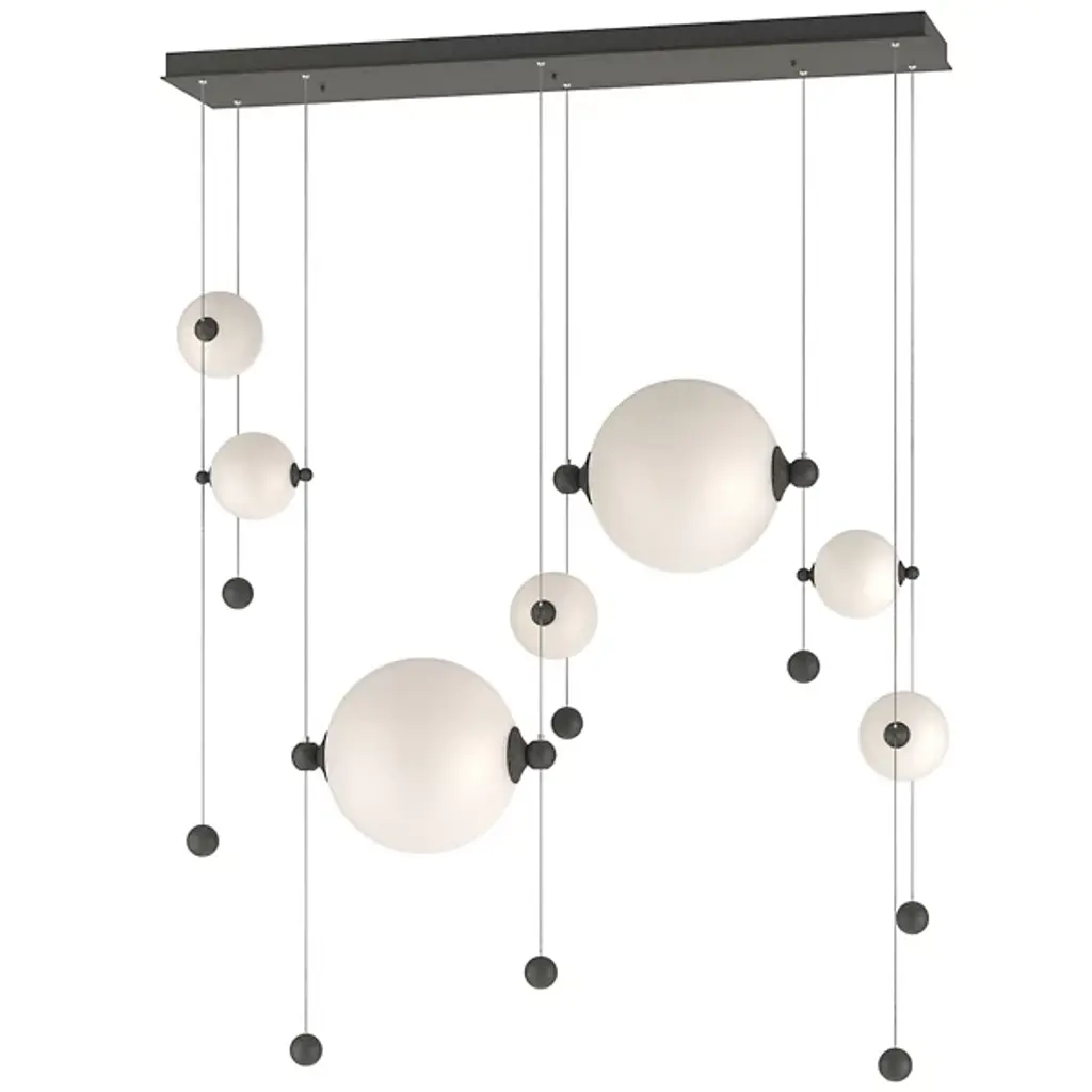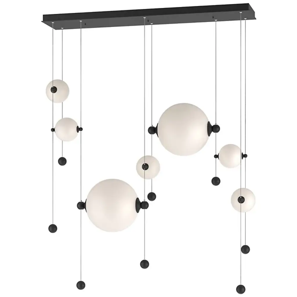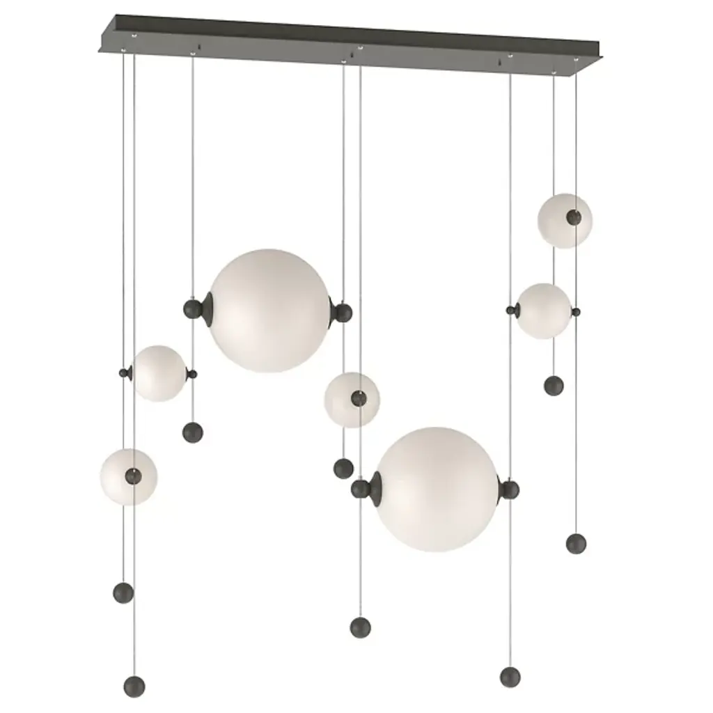 The Abacus Double LED Linear Suspension by Hubbardton Forge demands attention through its crisp, eye-catching design. This dynamic fixture is unique in its ability to be adjusted vertically, with its blown glass orbs set along slender cables that drop from a shared rectangular canopy. The orbs vary in size and direction and can be moved up or down the cables via threaded fasteners on either end. LEDs create a glowing beam within each shade while globe-shaped weights surround the lights at the end of each cable.