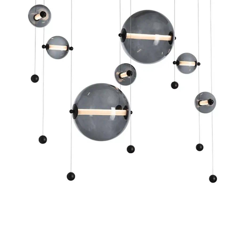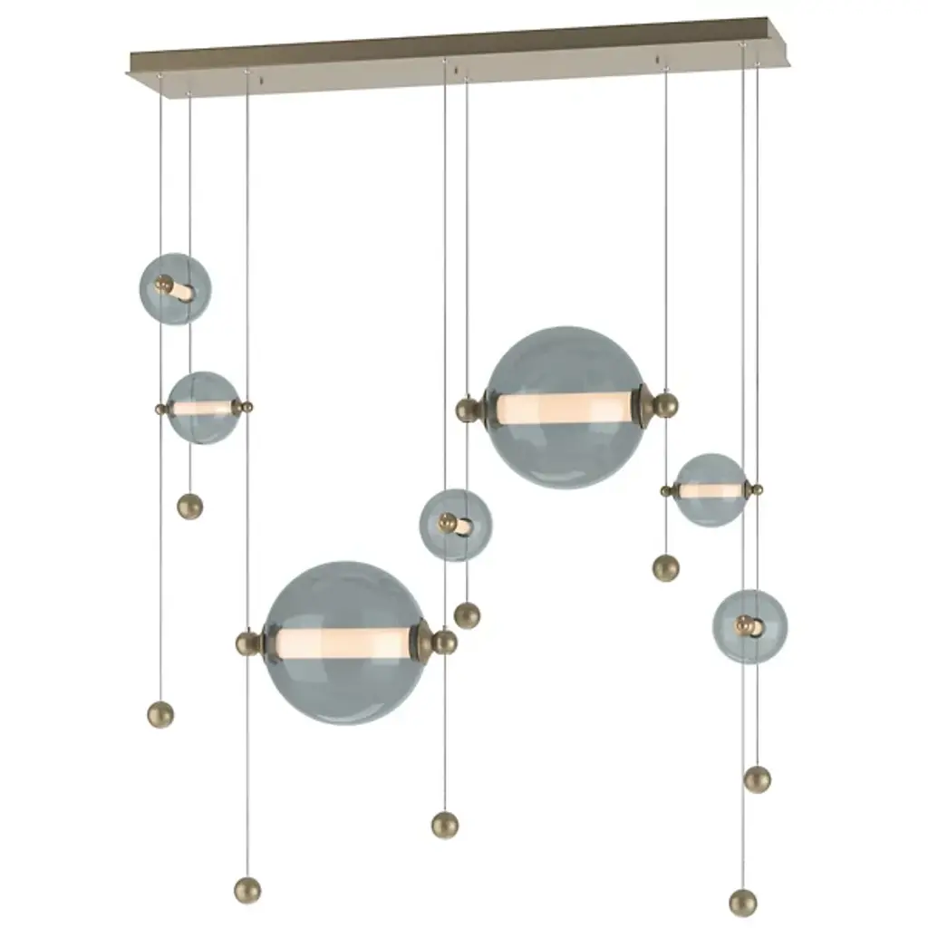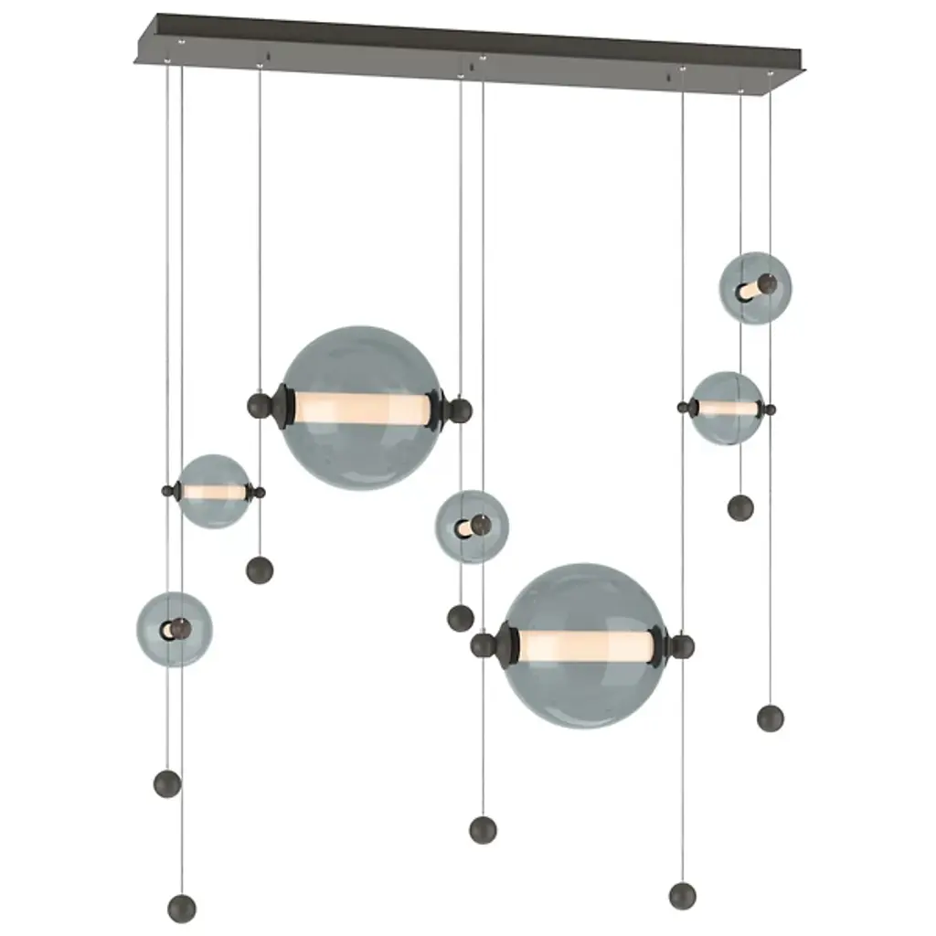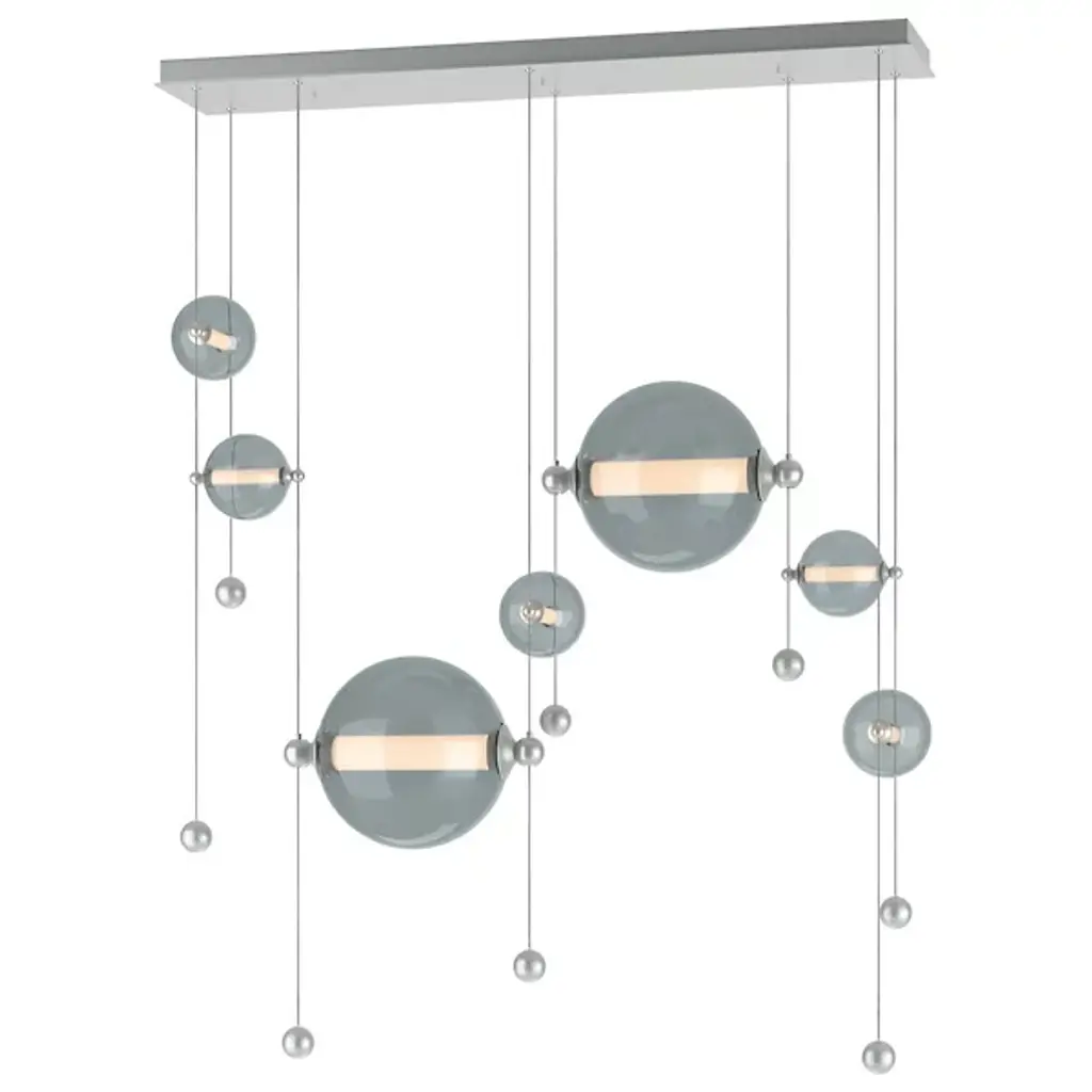 The Abacus Double LED Linear Suspension by Hubbardton Forge demands attention through its crisp, eye-catching design. This dynamic fixture is unique in its ability to be adjusted vertically, with its blown glass orbs set along slender cables that drop from a shared rectangular canopy. The orbs vary in size and direction and can be moved up or down the cables via threaded fasteners on either end. LEDs create a glowing beam within each shade while globe-shaped weights surround the lights at the end of each cable.