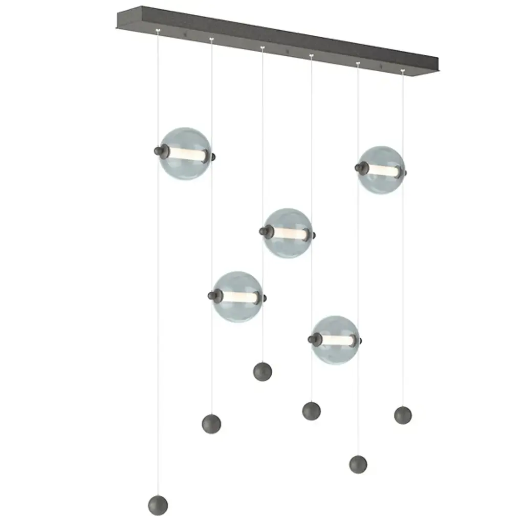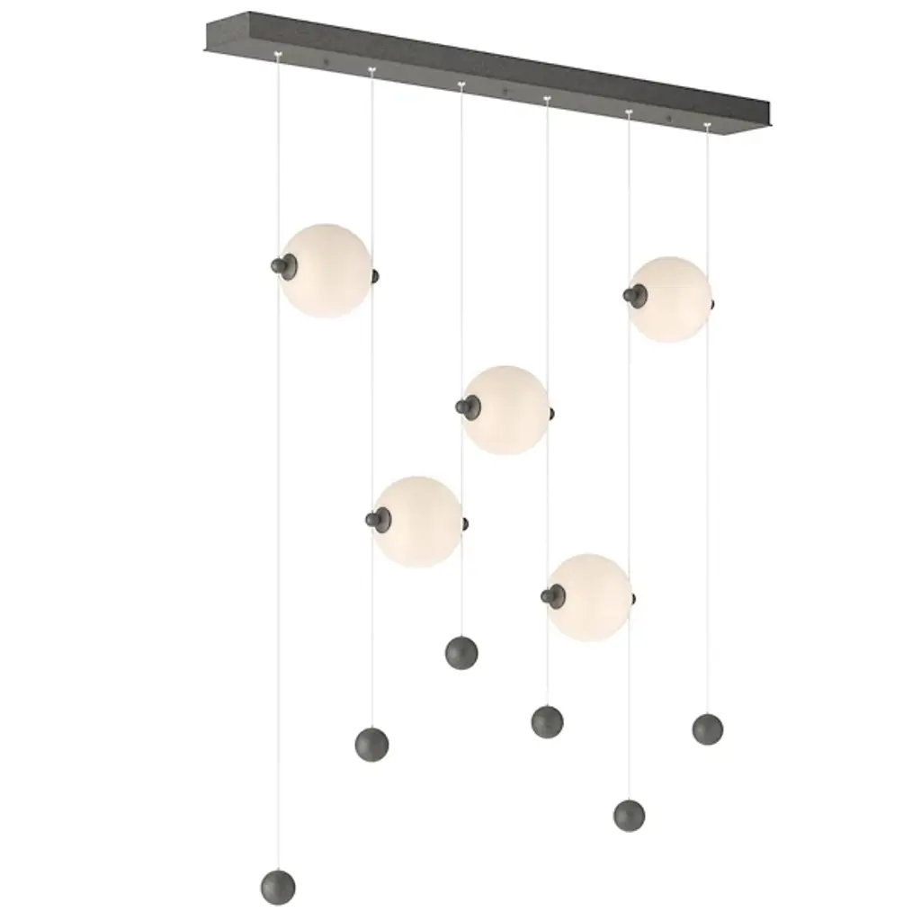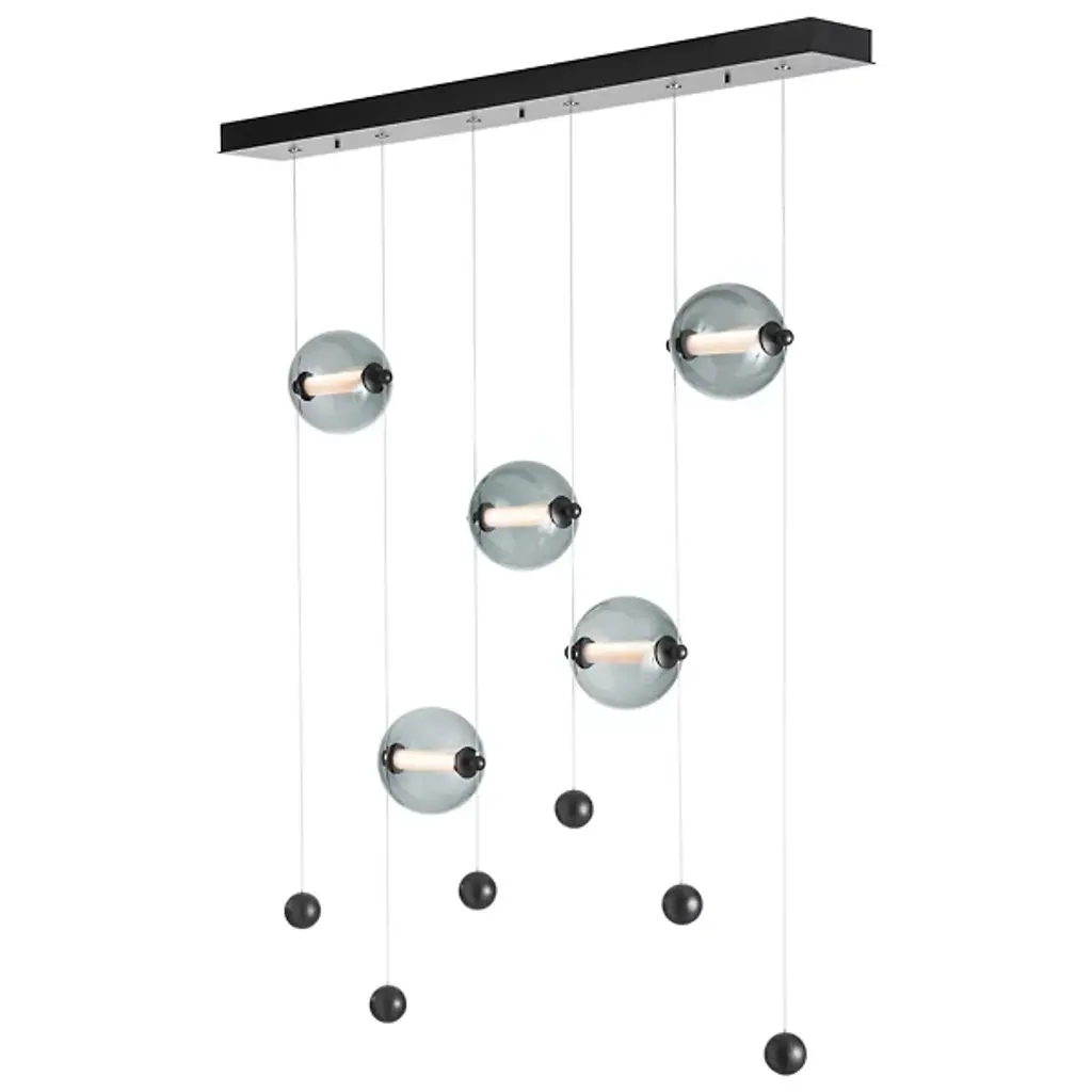Immediately inviting and eye-catching. The Abacus LED Linear Suspension from Hubbardton Forge is a stunning modern display that elegantly and evenly lights any room, matching a range of modern home decors. A thick rectangular ceiling mount presents four thin wires, each one capped off by smooth orbs. Throughout the piece hang clear spheres, seemingly floating as they delicately attach to the wires. Within each sphere is a crisp glow, created by an integrated, energy-efficient LED within a glass cylinder. Each piece contributes to the spread of an even, warm glow throughout the space, enchanting your modern space.