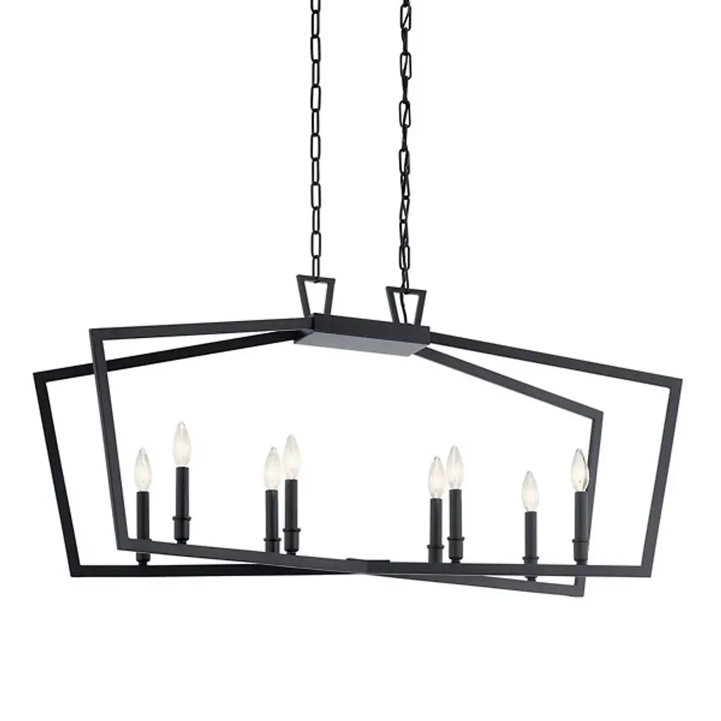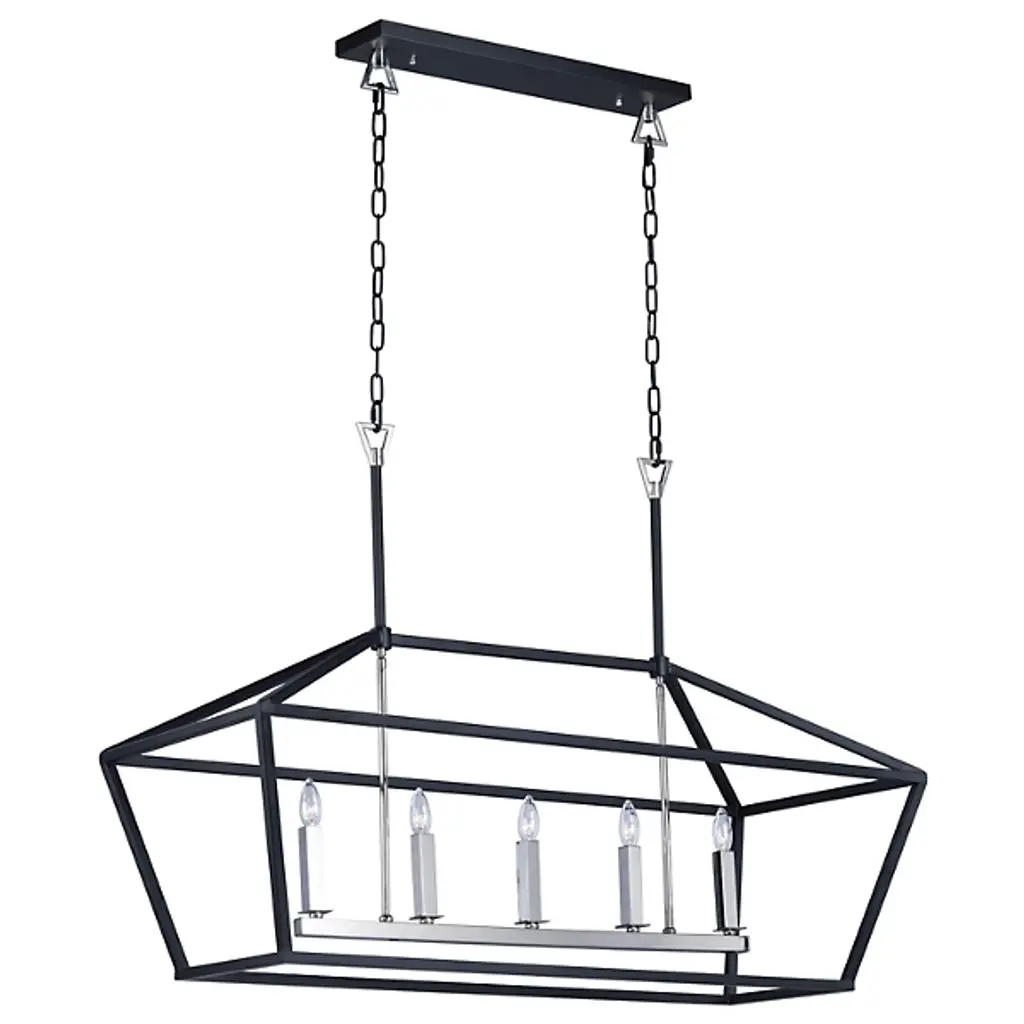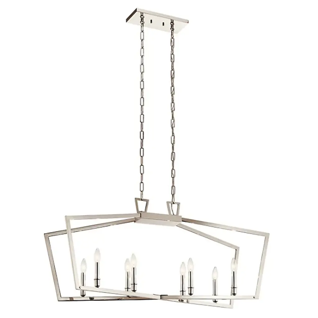 A fresh, contemporary twist on a classic style. The Abbotswell Linear Suspension by Kichler features two intersecting pentagons made of steel to create a geometric open cage. Changing in shape and size depending on how you view it, classic incandescent bulbs on candelabras are perched atop the bottom of the cage to emit a warm and uniformly balanced glow. This fixture is mounted to the ceiling by a rectangular canopy and chain-hung, ideal for application above dining tables and kitchen islands